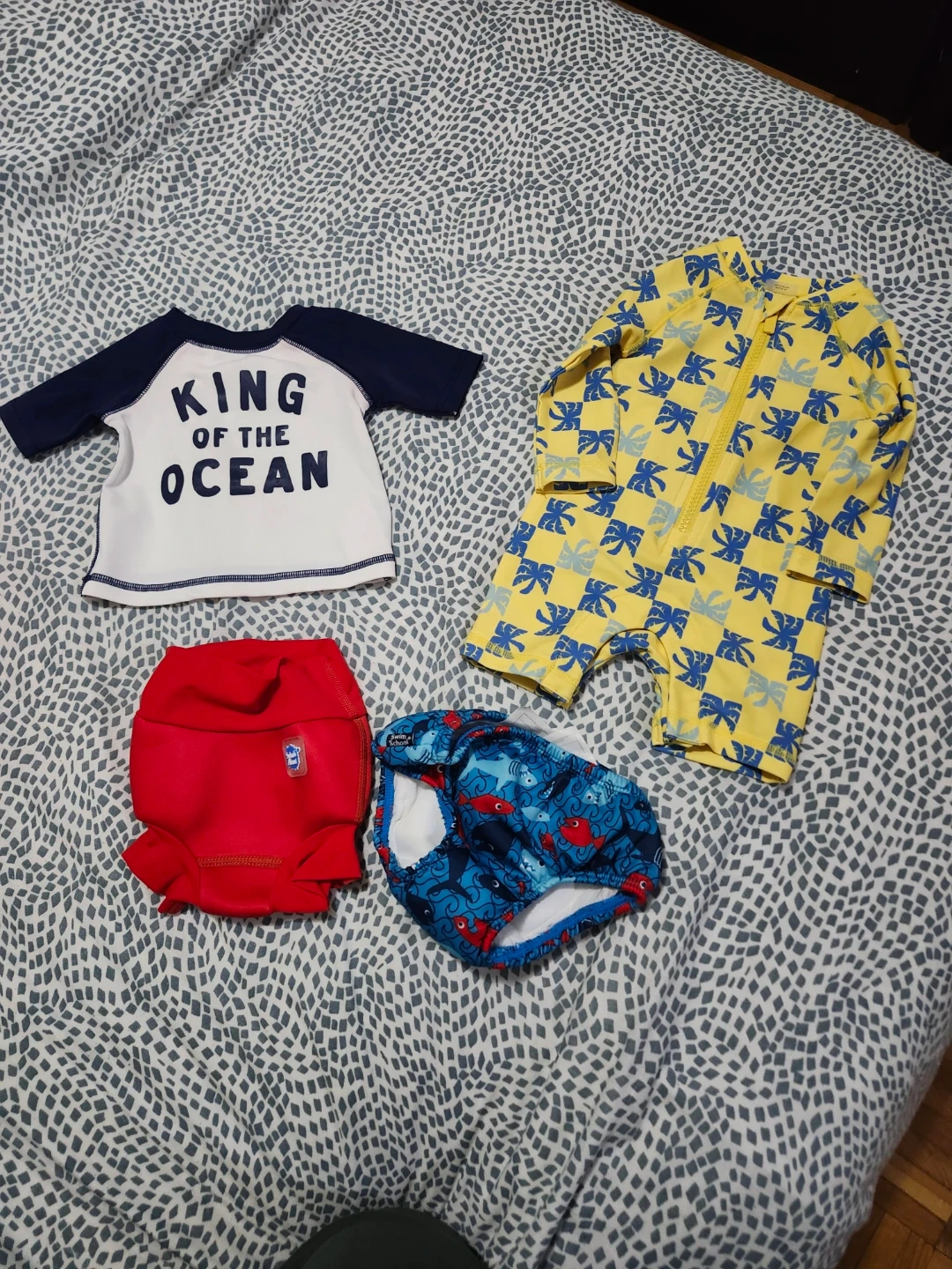 - Two swim diapers, one red and one with a blue fish pattern (0-3 months)
