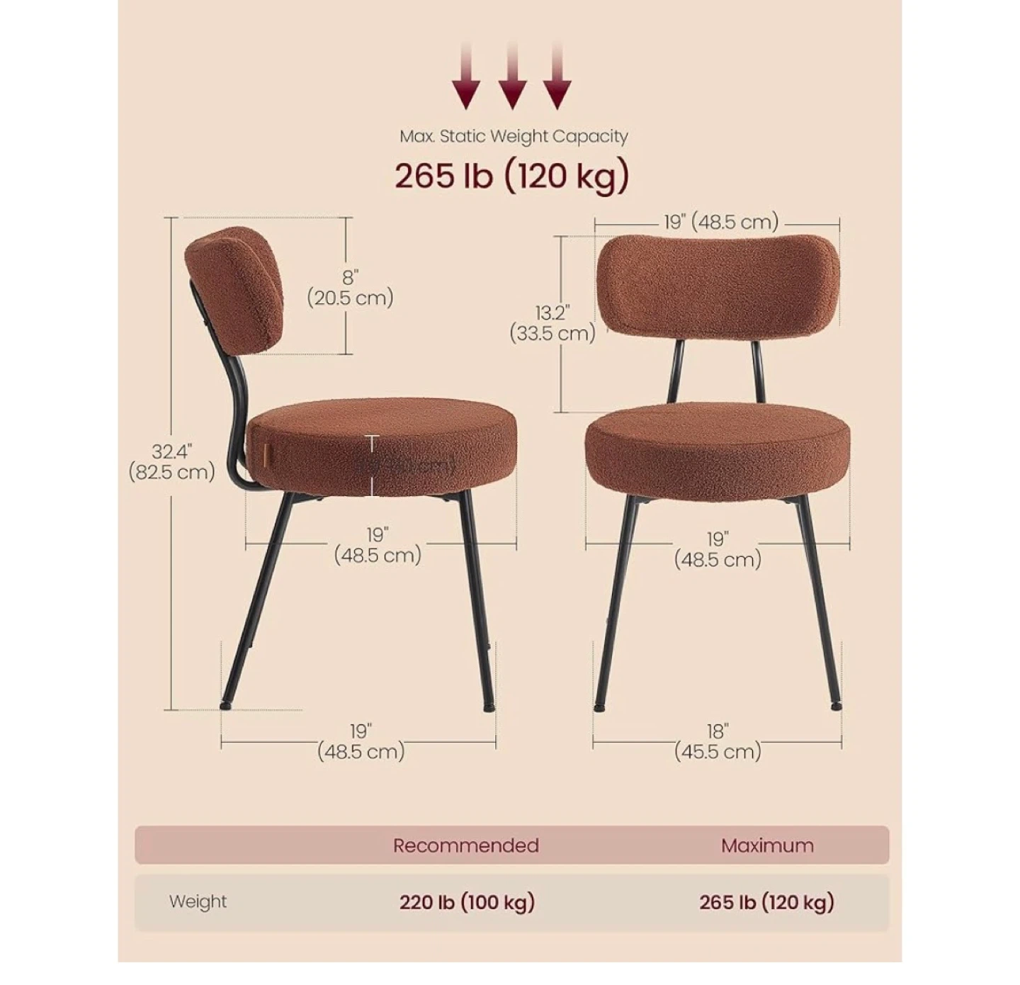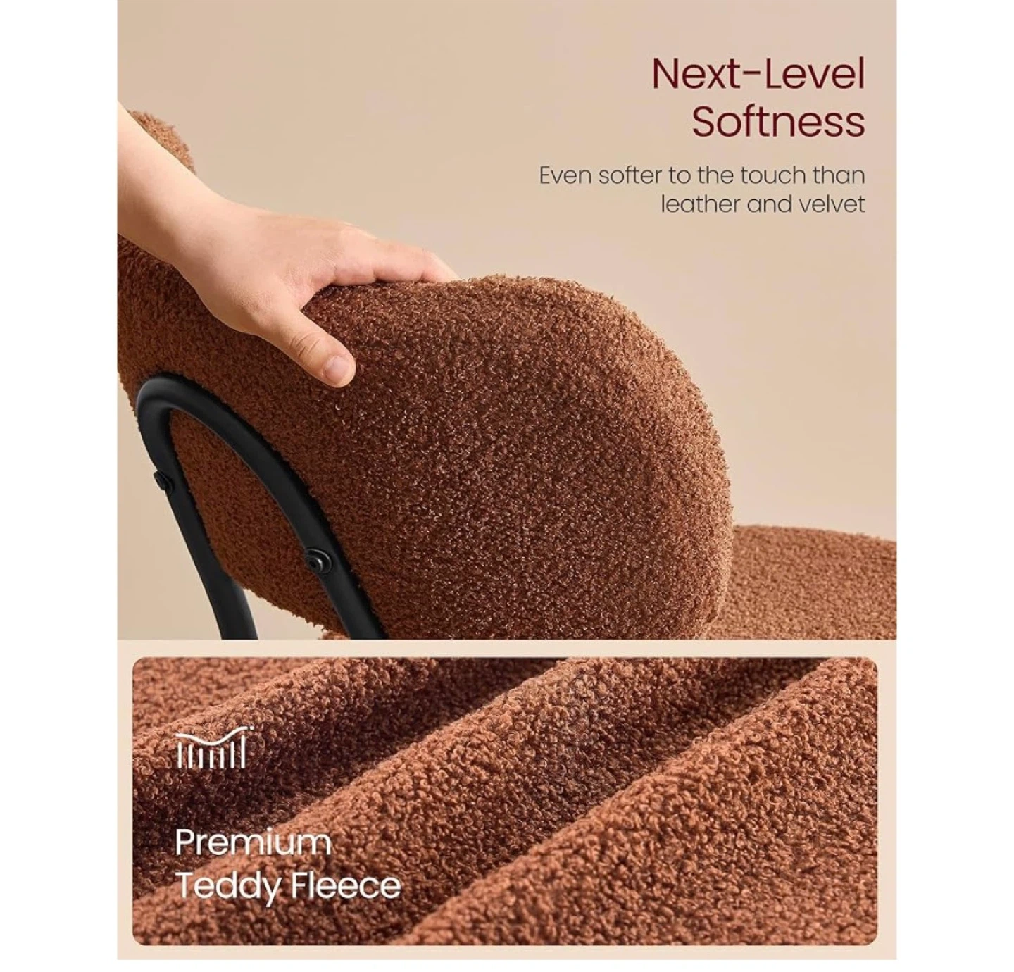 This chair features a premium teddy fleece upholstery for next-level softness. It has an extra-wide seat with a thick, plush cushion measuring 19" (48.5 cm) in diameter and 3.9" (10 cm) thick. The sturdy metal frame supports up to 265 lb (120 kg).