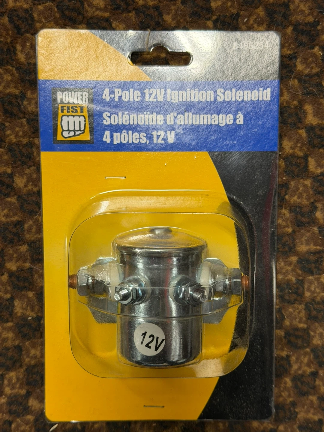 This is a 4-pole, 12V ignition solenoid from Power Fist. It's still in its original packaging. This part is essential for starting your vehicle's engine.
