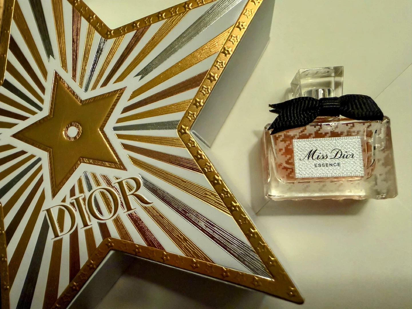 This is a Miss Dior Essence miniature perfume by Dior. It includes its original star-shaped box. The fragrance is a delicate floral scent.