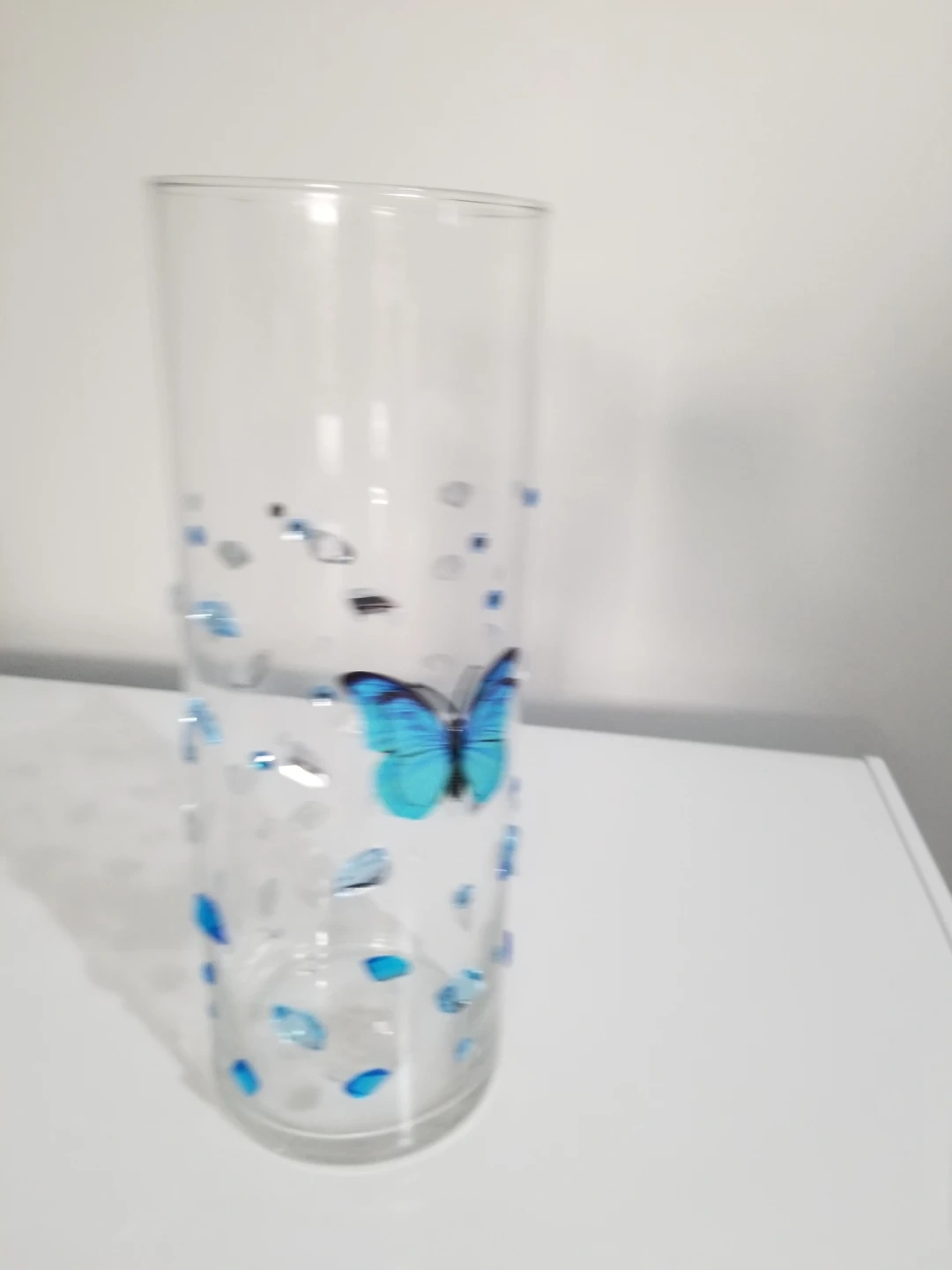 This is a clear glass vase with a decorative blue butterfly design. It's perfect for holding flowers or as a standalone decorative piece. The vase is made of glass.