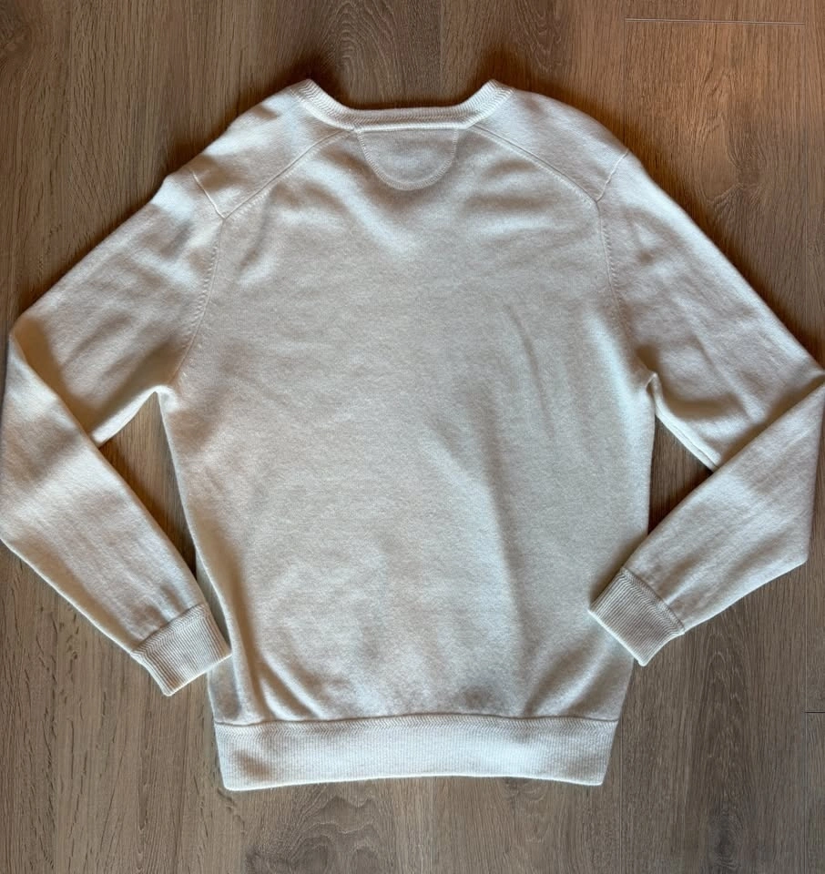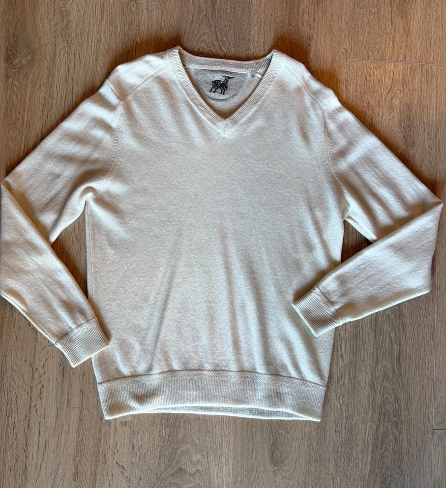 Men's Raffi 100% cashmere white v-neck sweater in excellent condition. Great quality cashmere, very warm, bought for $300+tax. Size: Medium. Pick up: downtown Toronto.