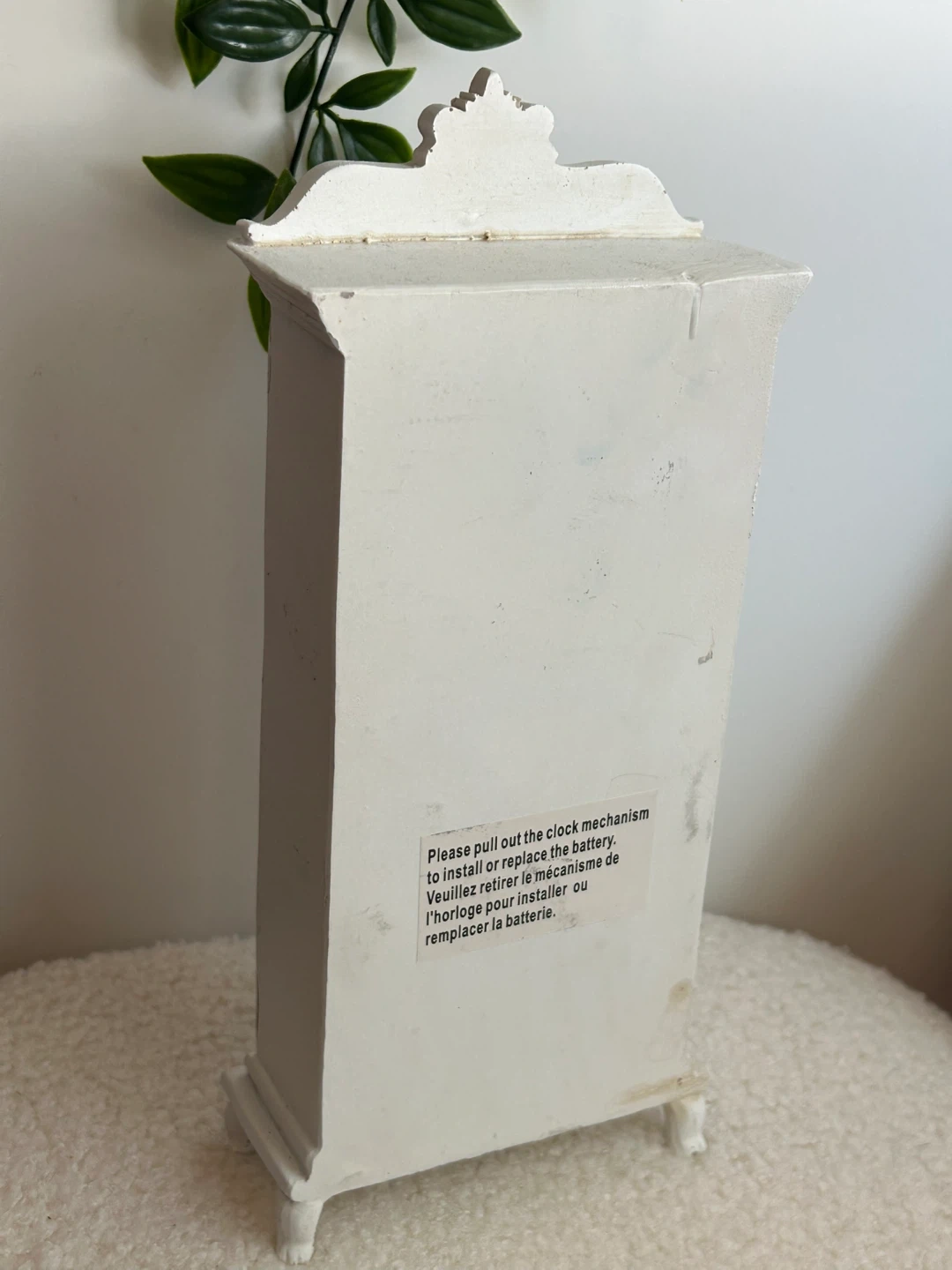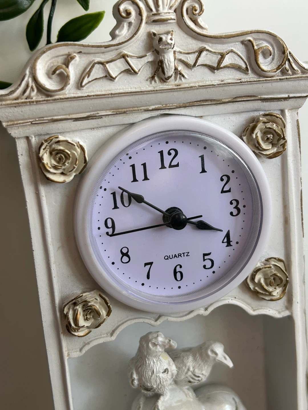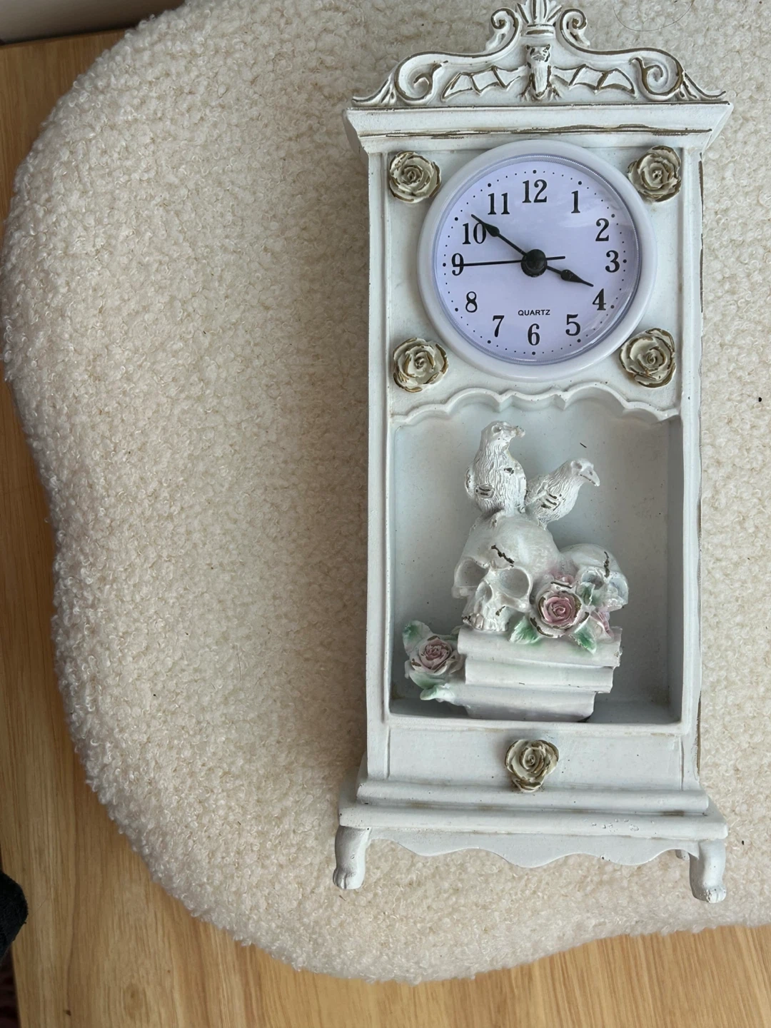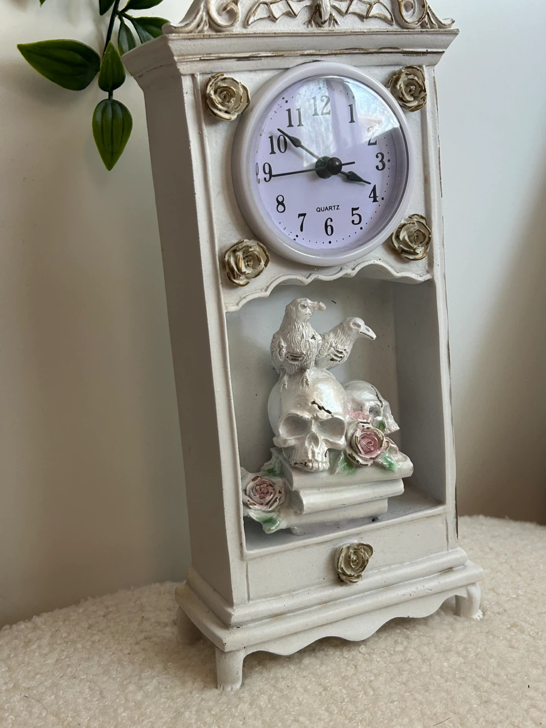 This decorative mantel clock features an ornate white finish with gold rose accents. It has a quartz movement and a whimsical gothic-inspired design with a skull and birds vignette. Requires one AA battery (not included).