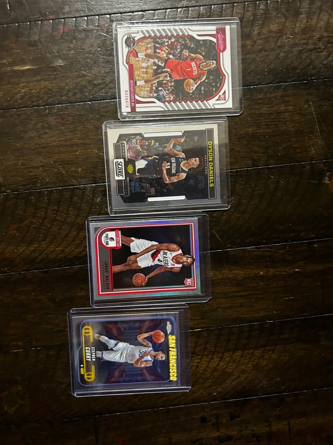 Collection of four NBA basketball trading cards. Includes Stephen Curry, Jabari Walker, Dyson Daniels, and Jabari Smith Jr. cards. These are officially licensed sports collectibles.