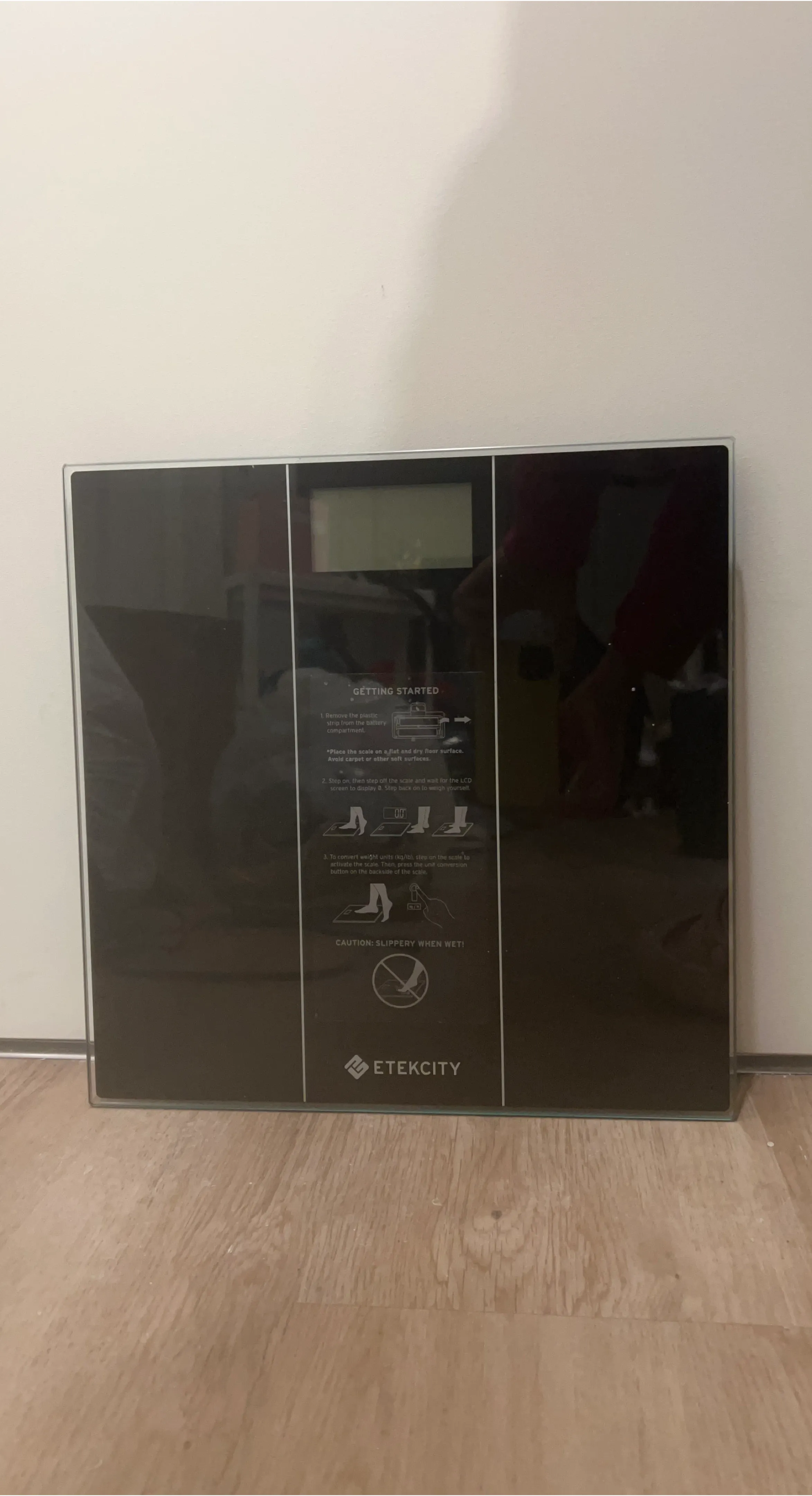 This is an Etekcity digital body weight scale with a sleek, black glass surface. It's designed for accurate weight measurements on flat, dry surfaces. Easy to use with a clear LCD display and unit conversion options.
