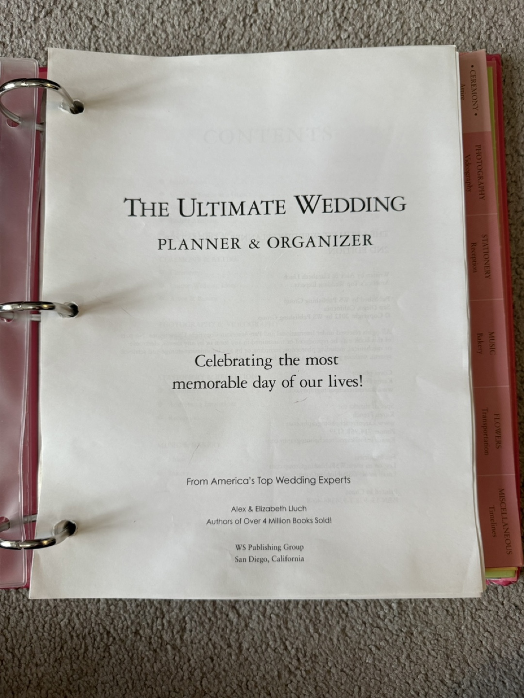 The Ultimate Wedding Planner & Organizer by Alex and Elizabeth Lluch. Binder book that you can write and fill in! Comes with a free reusable bag. Original cad 45$.