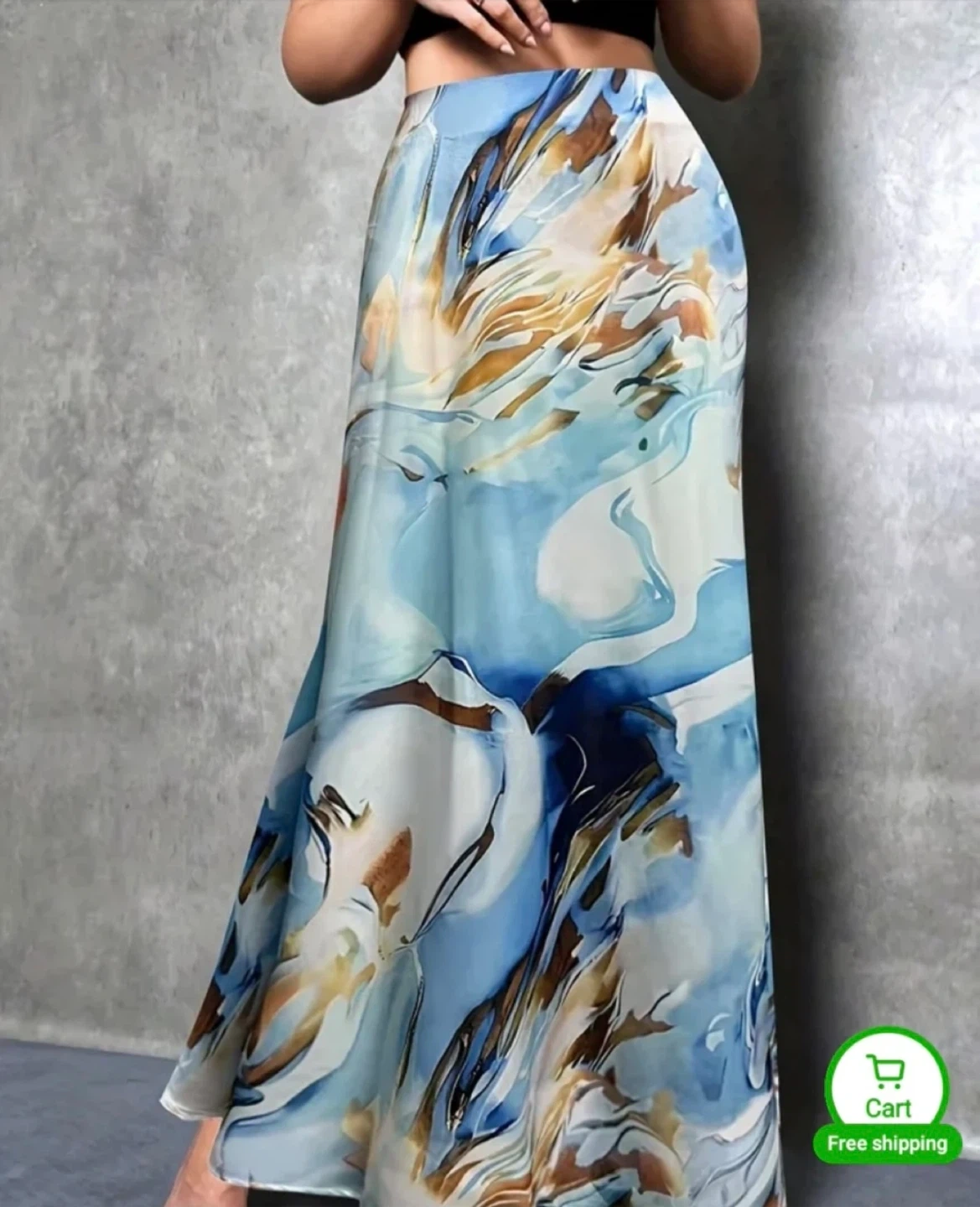 This flowy satin maxi skirt features a vibrant blue pattern. It's made from a lightweight material for comfortable wear. Perfect for dressing up or down!