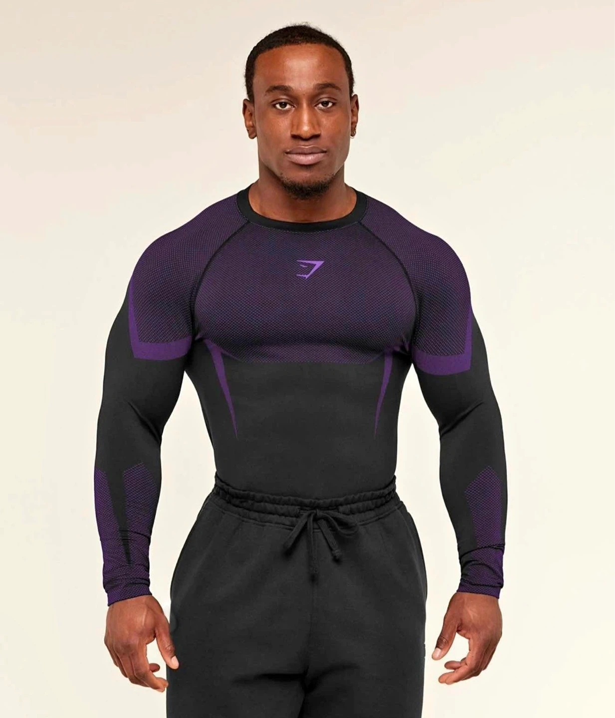 This is a Gymshark long sleeve shirt in black with purple accents. It's made with a seamless knit fabric. Great for athletic activities!