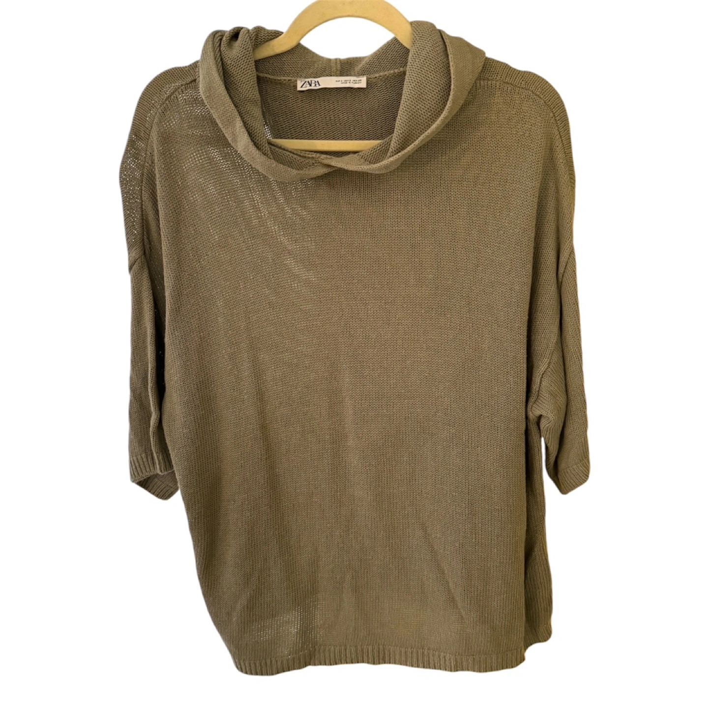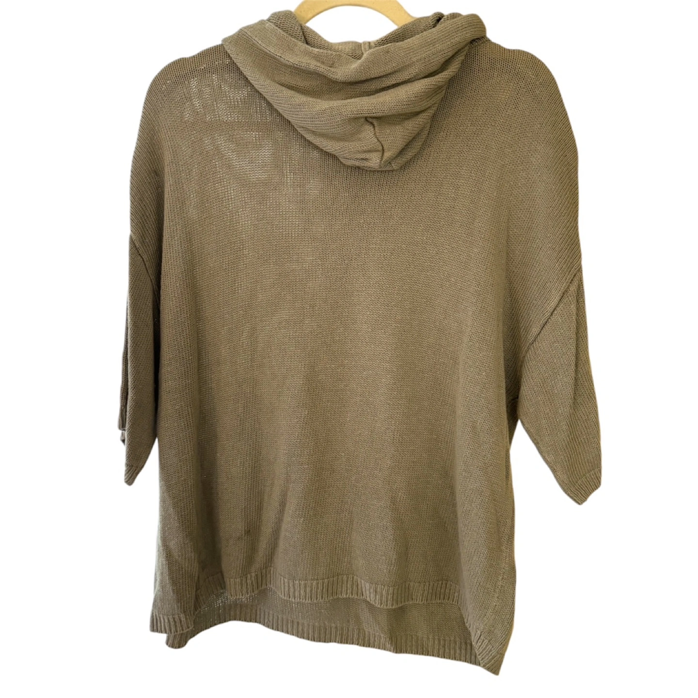 Mossy green knit sweater with a hood and short baggy sleeves.