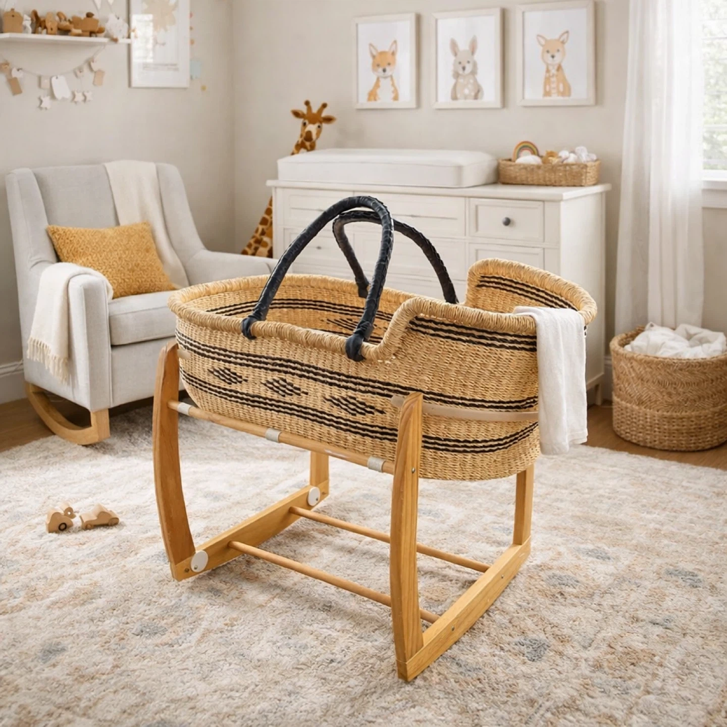 A hand-woven Moses basket bassinet featuring a natural straw colour with black striped accents. It's mounted on a sturdy wooden rocking stand for gentle motion. Includes a comfortable, padded mattress.