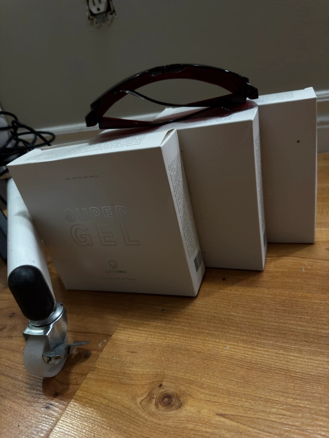 LED teeth whitening machine with three kits. It includes the main unit, a stand with wheels, and protective eyewear. The LED lamp is adjustable and the stand provides easy manoeuvrability.