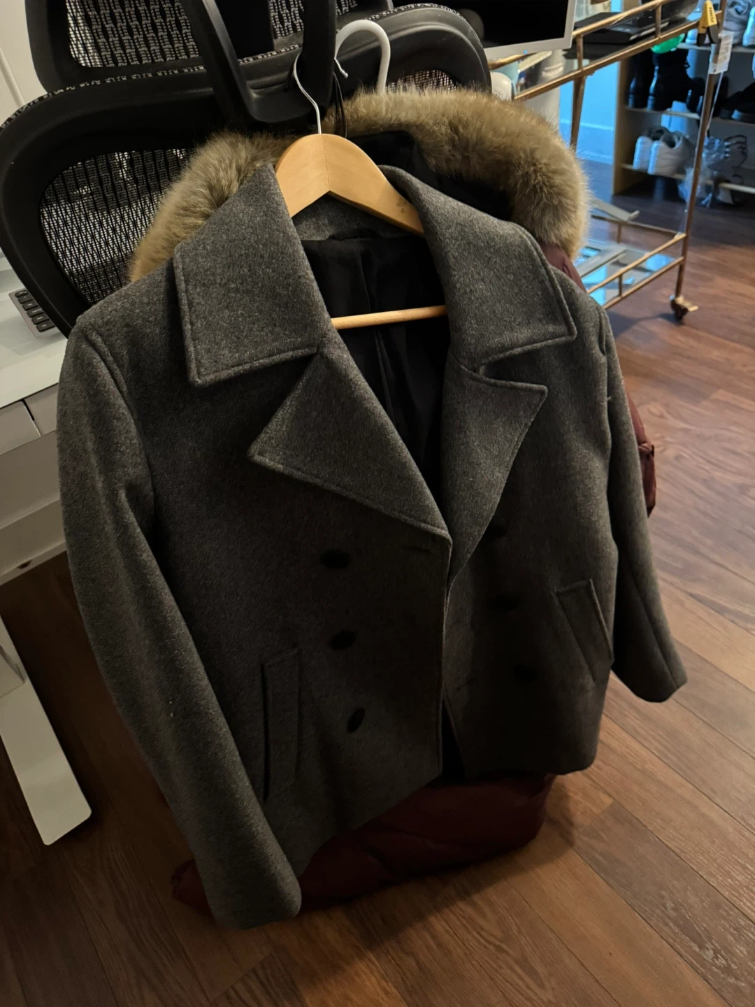 Selling a stylish grey wool peacoat! perfect for staying warm during the colder months. It's in great condition and ready for a new home