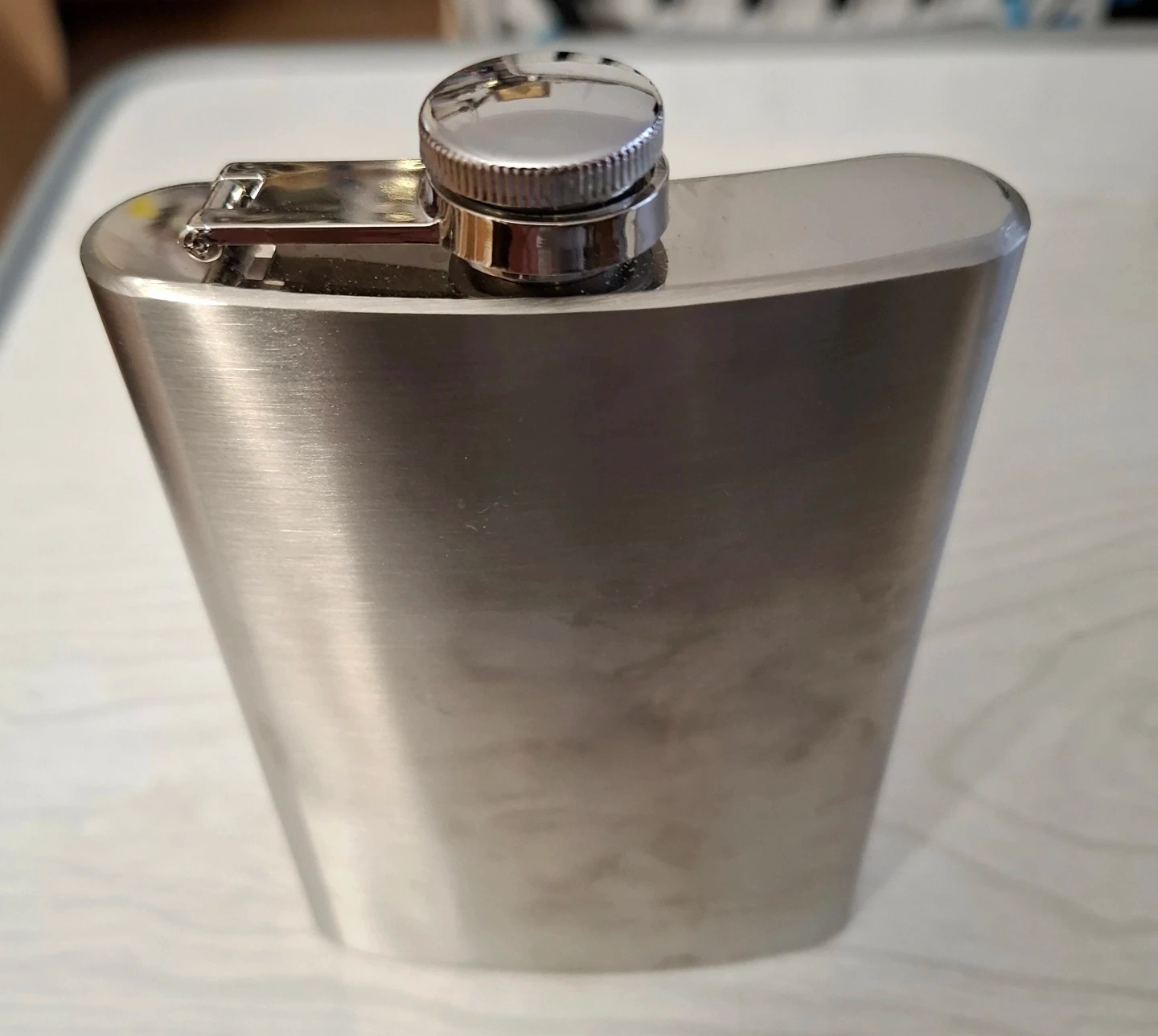 This is a classic stainless steel hip flask. It's got a brushed metal finish and a secure screw-top lid. Perfect for keeping your favourite drink on hand!