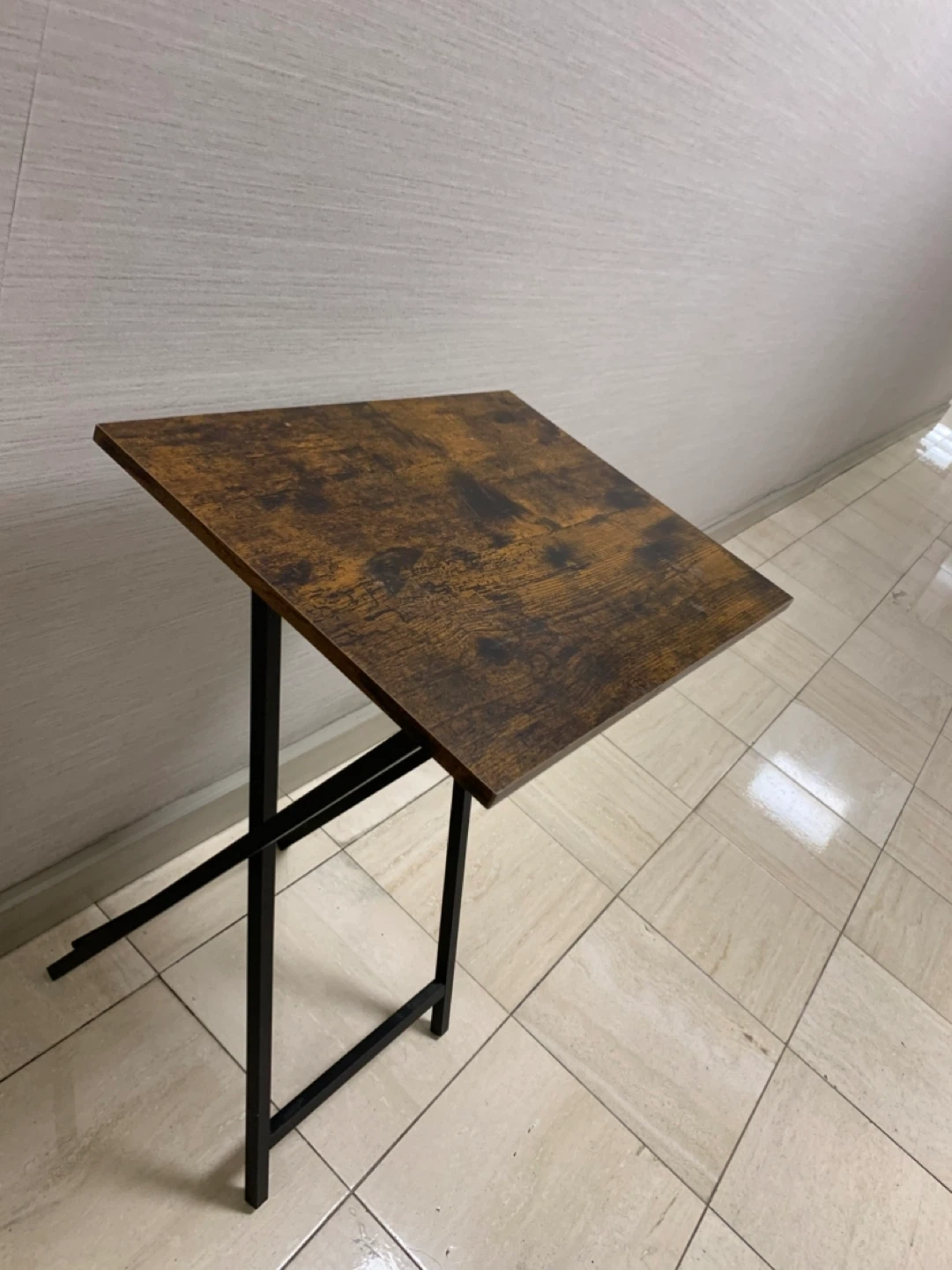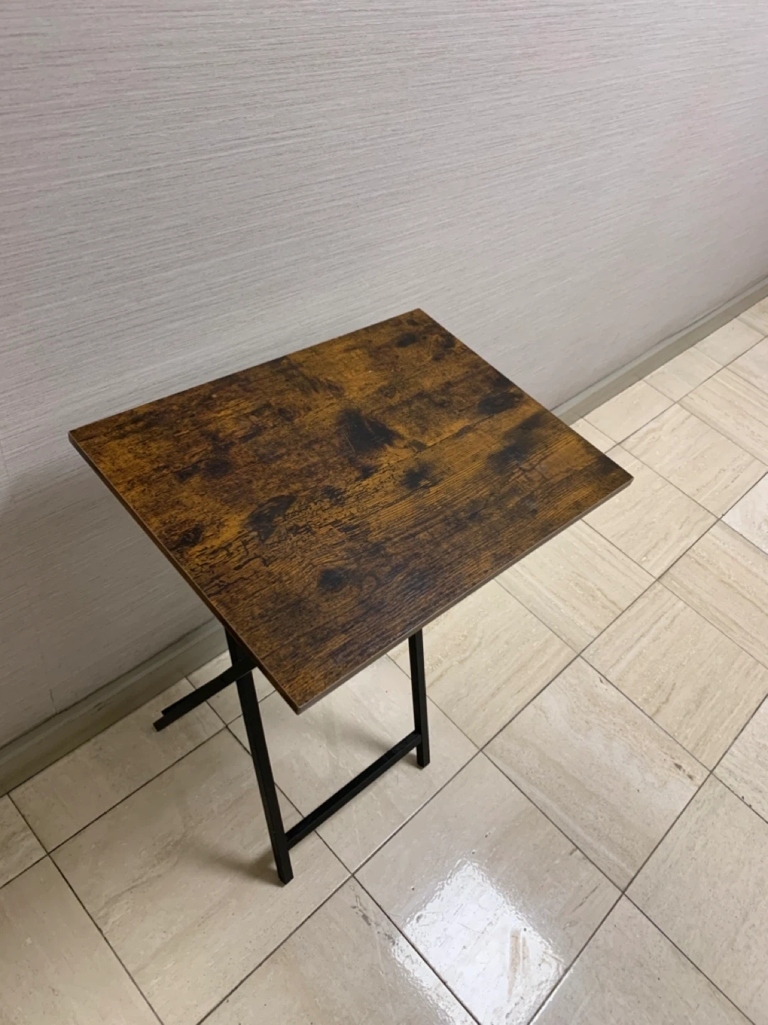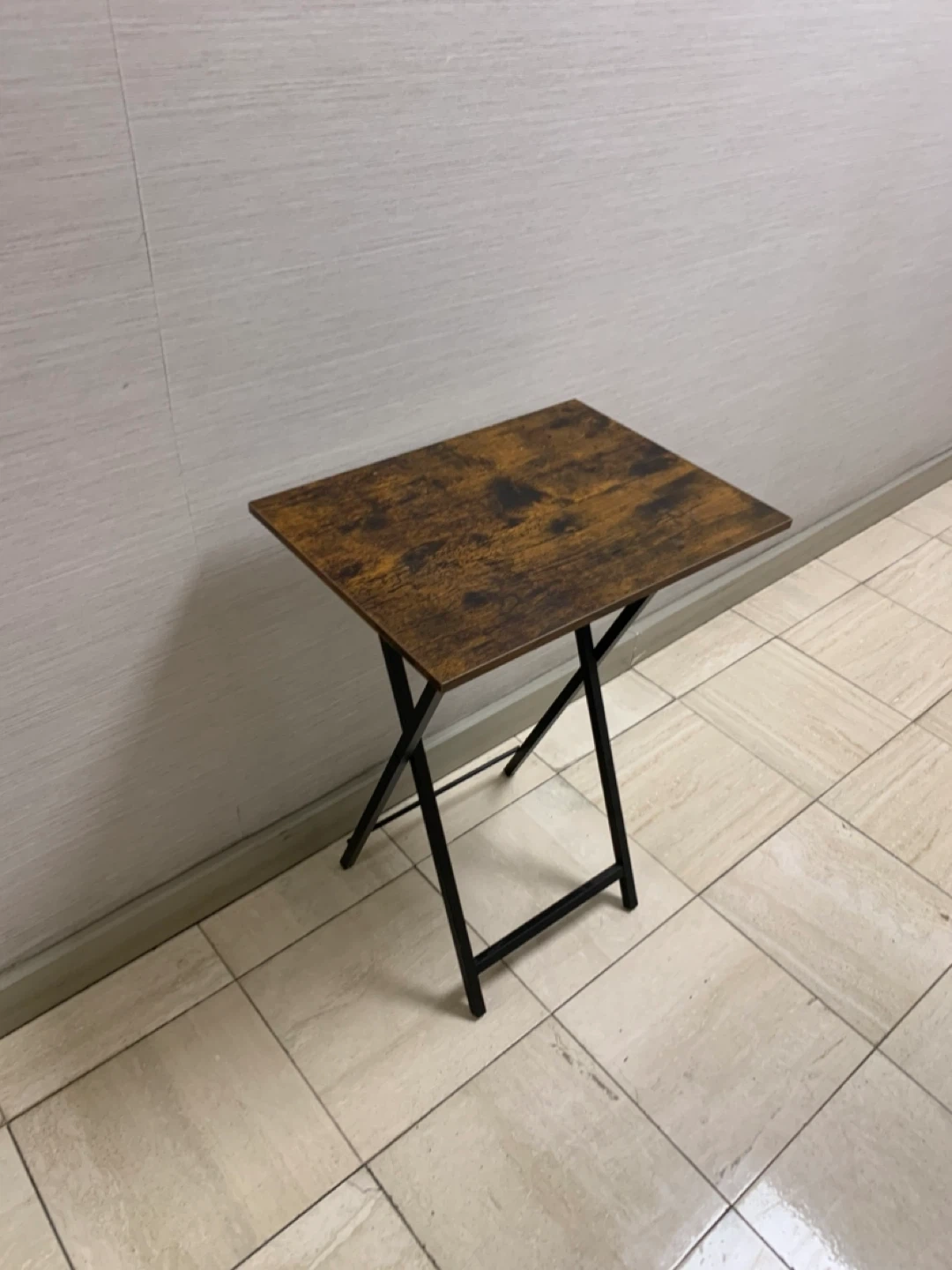A handy folding side table with a wood-look top and black metal legs. It's lightweight and folds flat for easy storage. Perfect for small spaces or extra surface area when you need it!