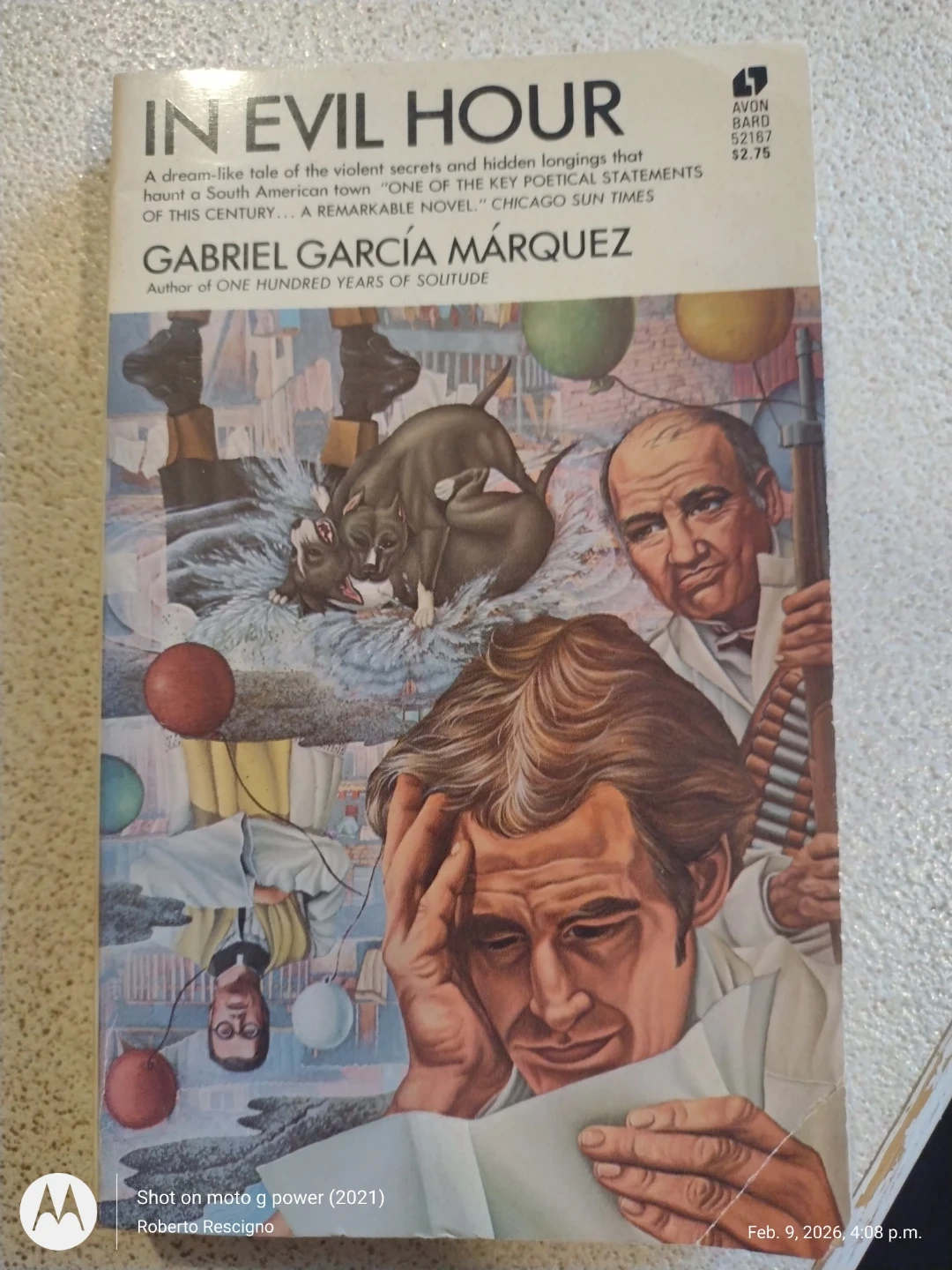 This is a paperback copy of "In Evil Hour" by Gabriel García Márquez. It's a remarkable novel published by Avon Bard. The book includes the author's bio and notes on its significance.