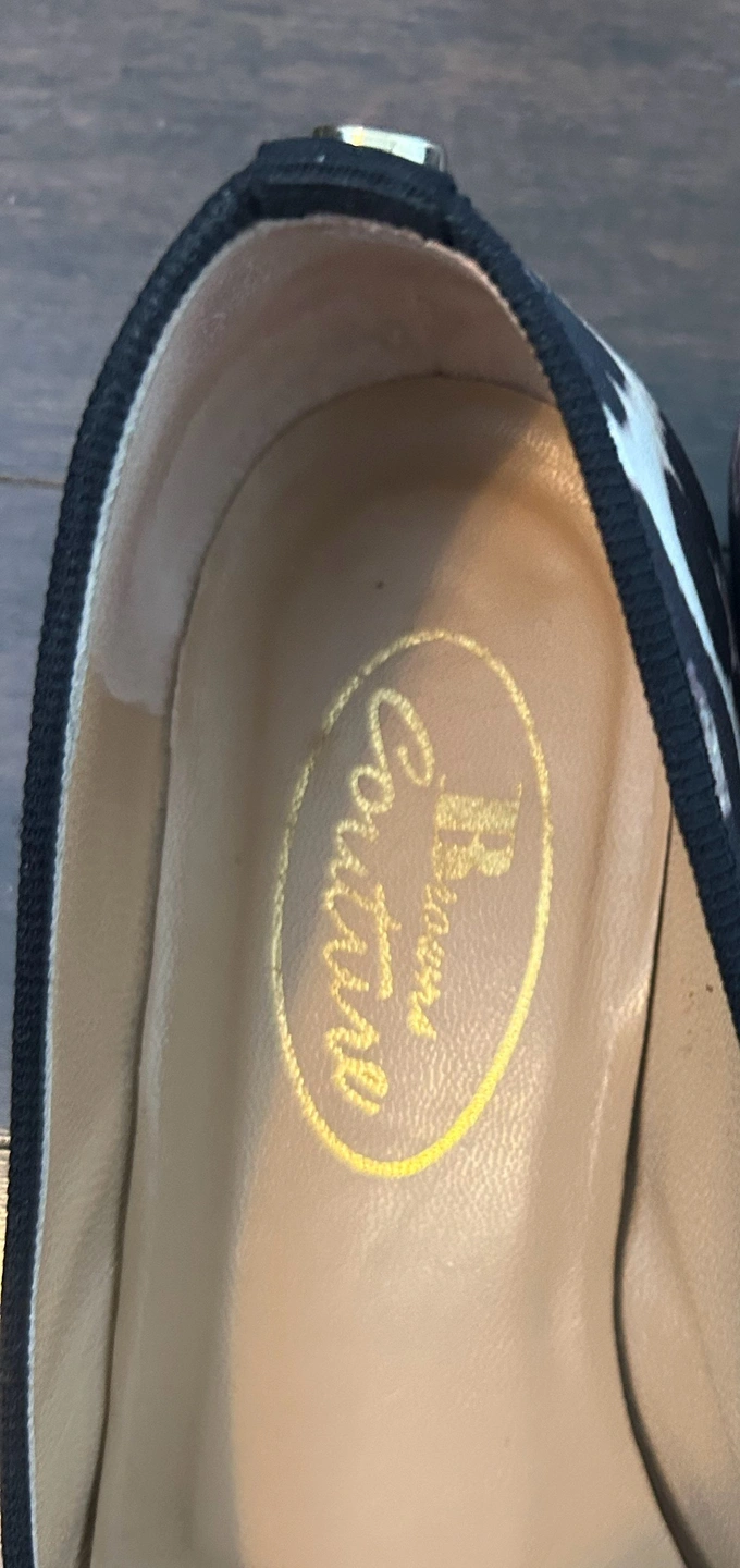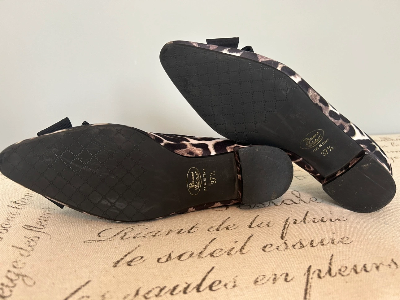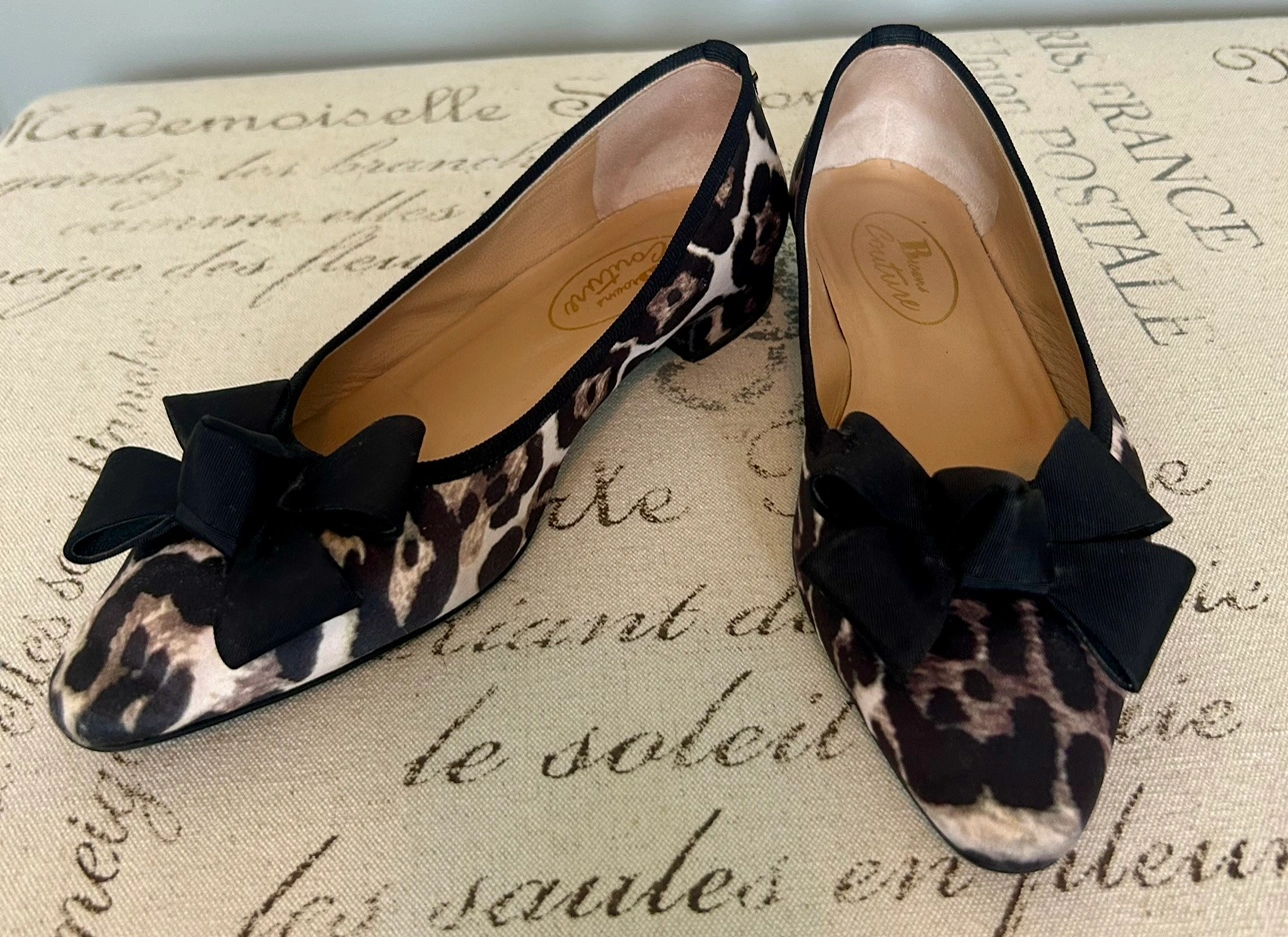 Browns couture silk leopard flats with black cord piping and structured bow.