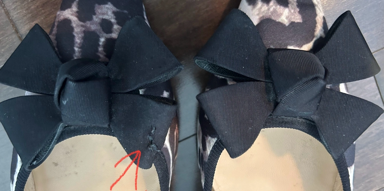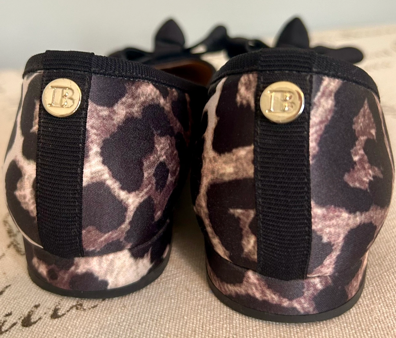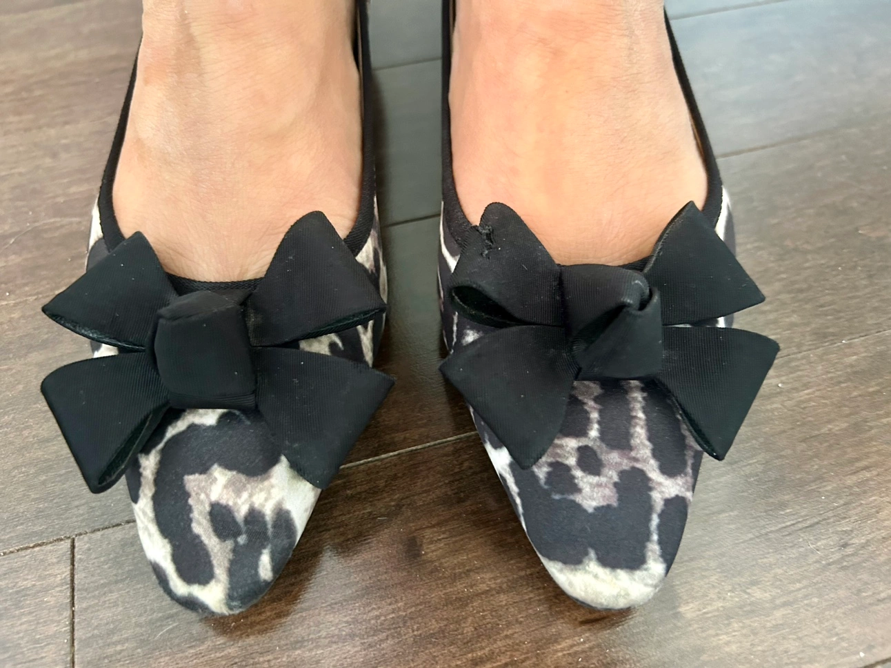 These are a pair of black and white leopard print flats with a black bow on the front. They are comfortable and stylish.