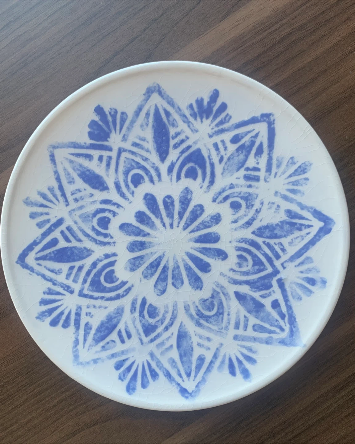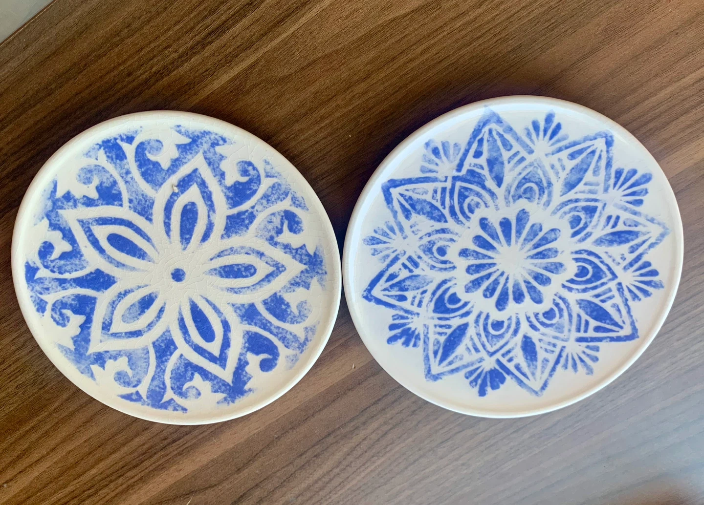 Selling a set of two decorative ceramic plates. Each plate features a unique blue and white mandala-style design. These are great for display or for serving small snacks!