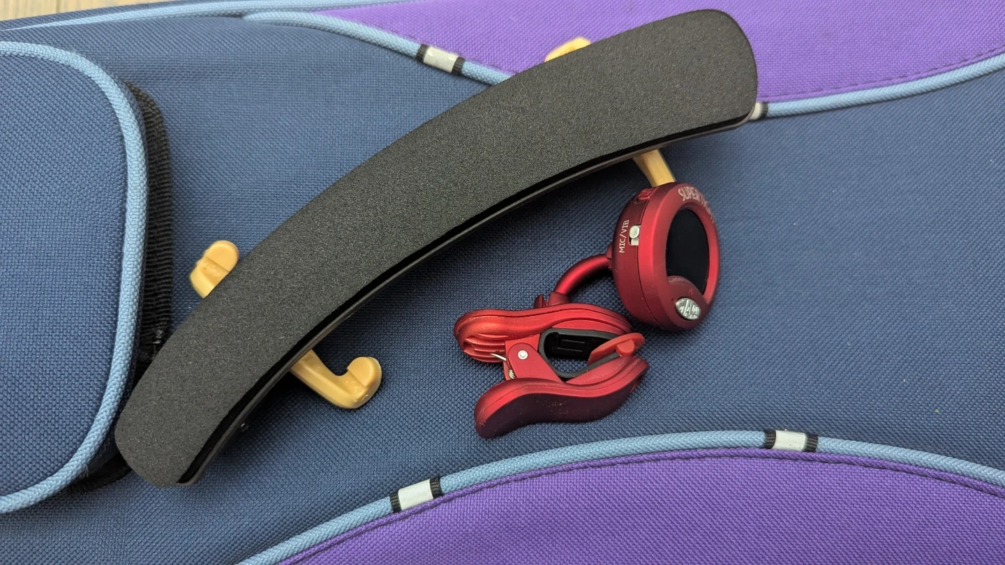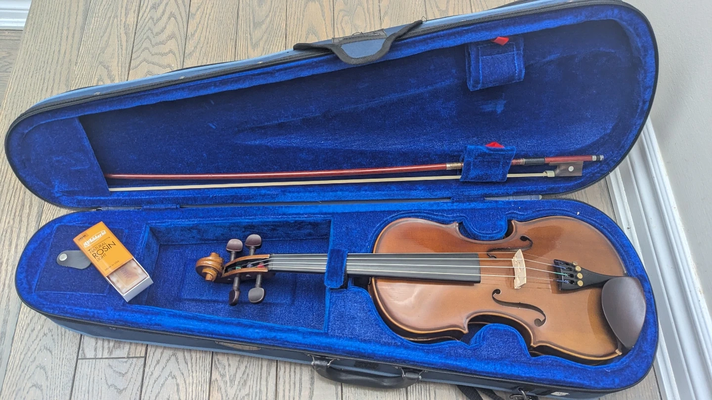 A violin complete with everything you need for practice. It's a lightly used violin in a blue hard case with velvet lining. Includes a bow, a block of rosin, a clip-on electronic tuner, and a shoulder rest. This set is great for aspiring musicians!