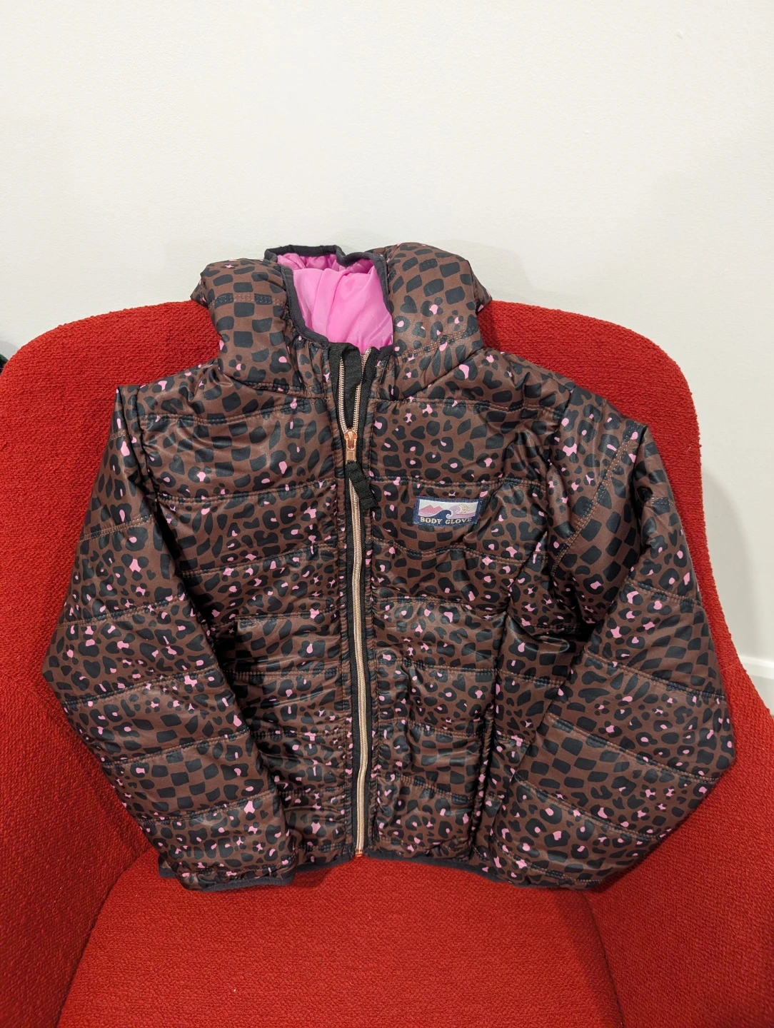 Here's a Body Glove puffer jacket in a fun leopard print! It features a pink lining and is perfect for keeping warm on chilly days