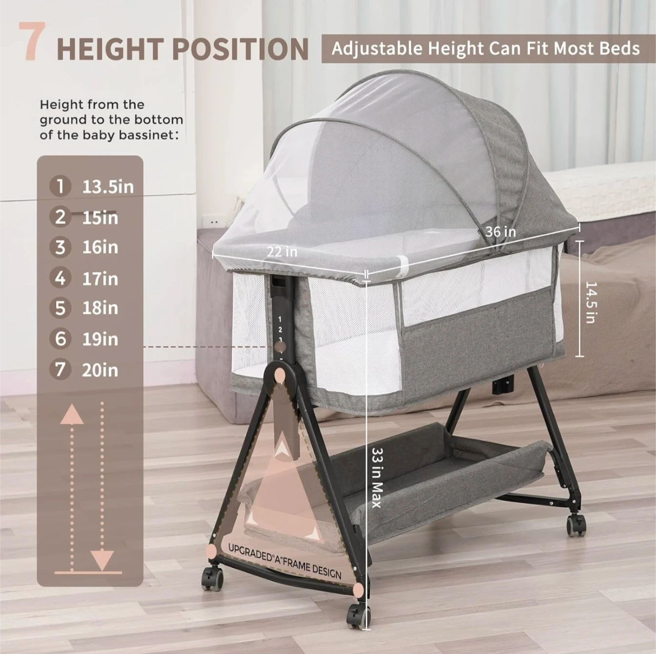 Adjustable Height: Has 6 height levels to align perfectly with almost any bed frame.