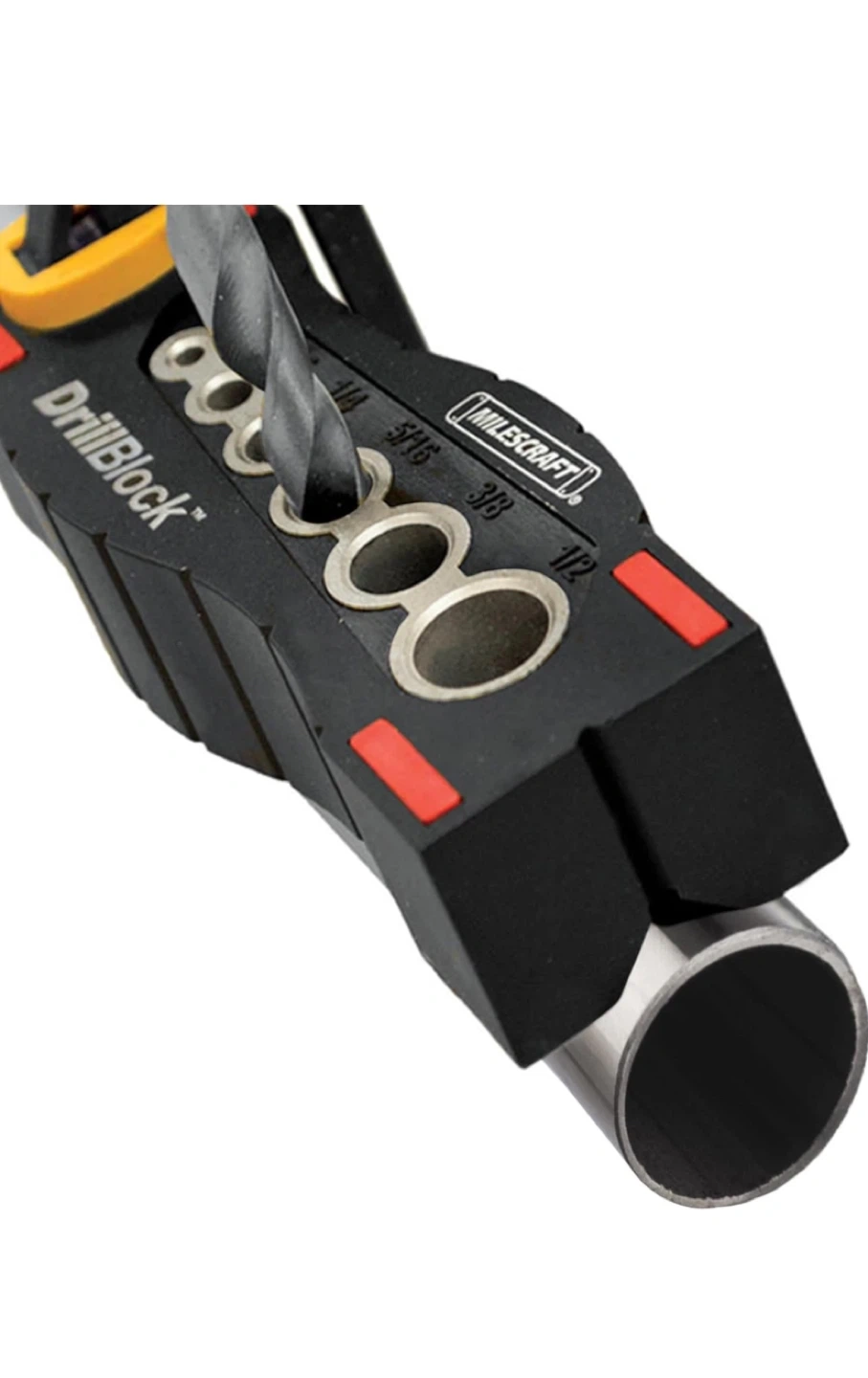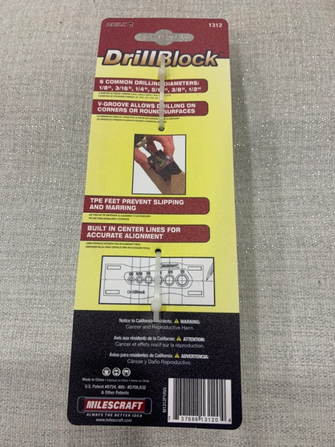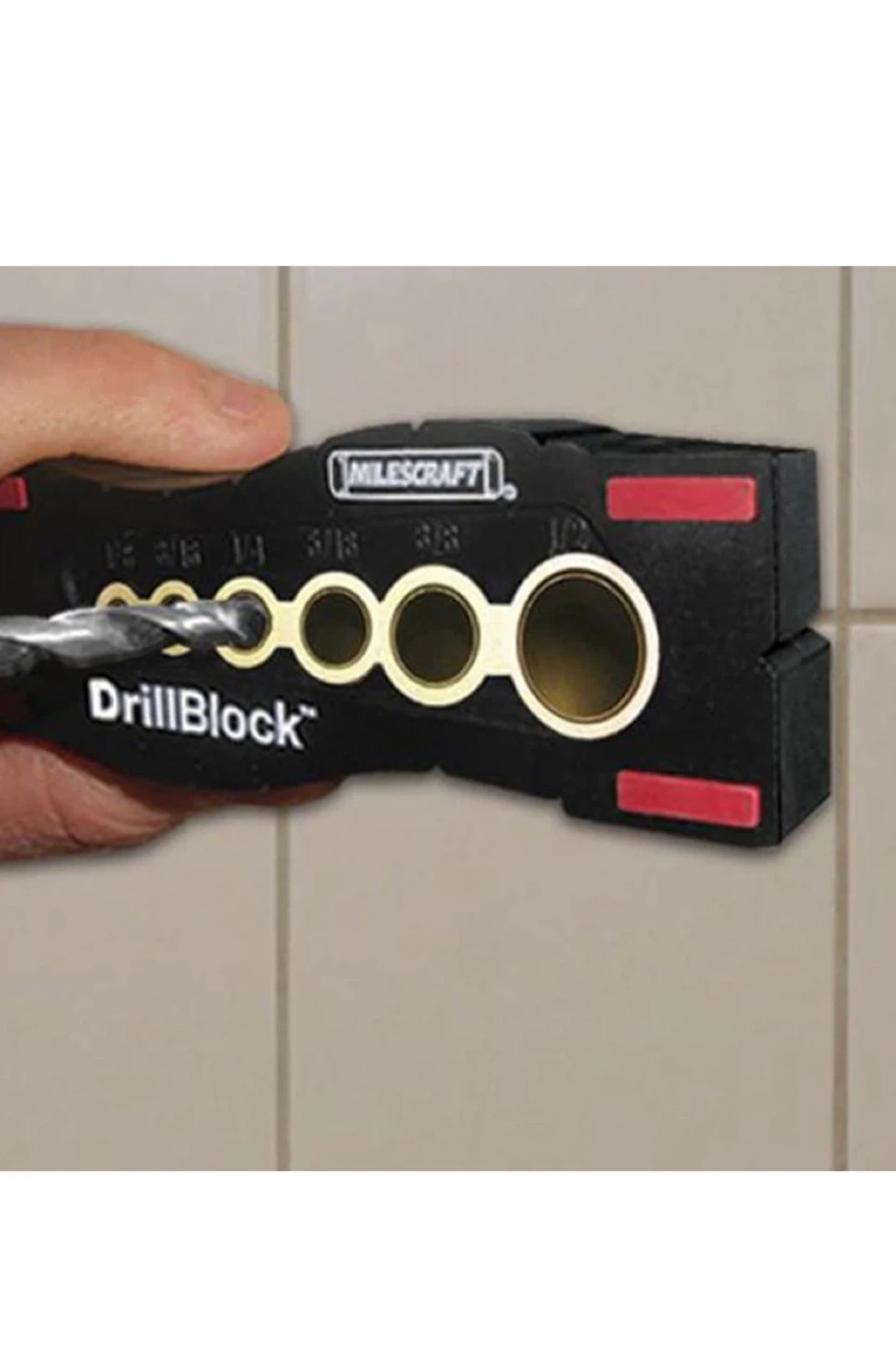 This Milescraft DrillBlock is designed for making straight holes every time. It has six common drilling diameters: 1/8", 3/16", 1/4", 5/16", 3/8", and 1/2". The V-groove allows for drilling on corners or round surfaces, and TPE feet prevent slipping and marring. Built-in center lines ensure accurate alignment.