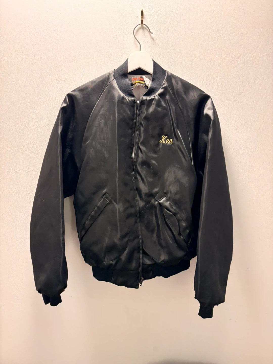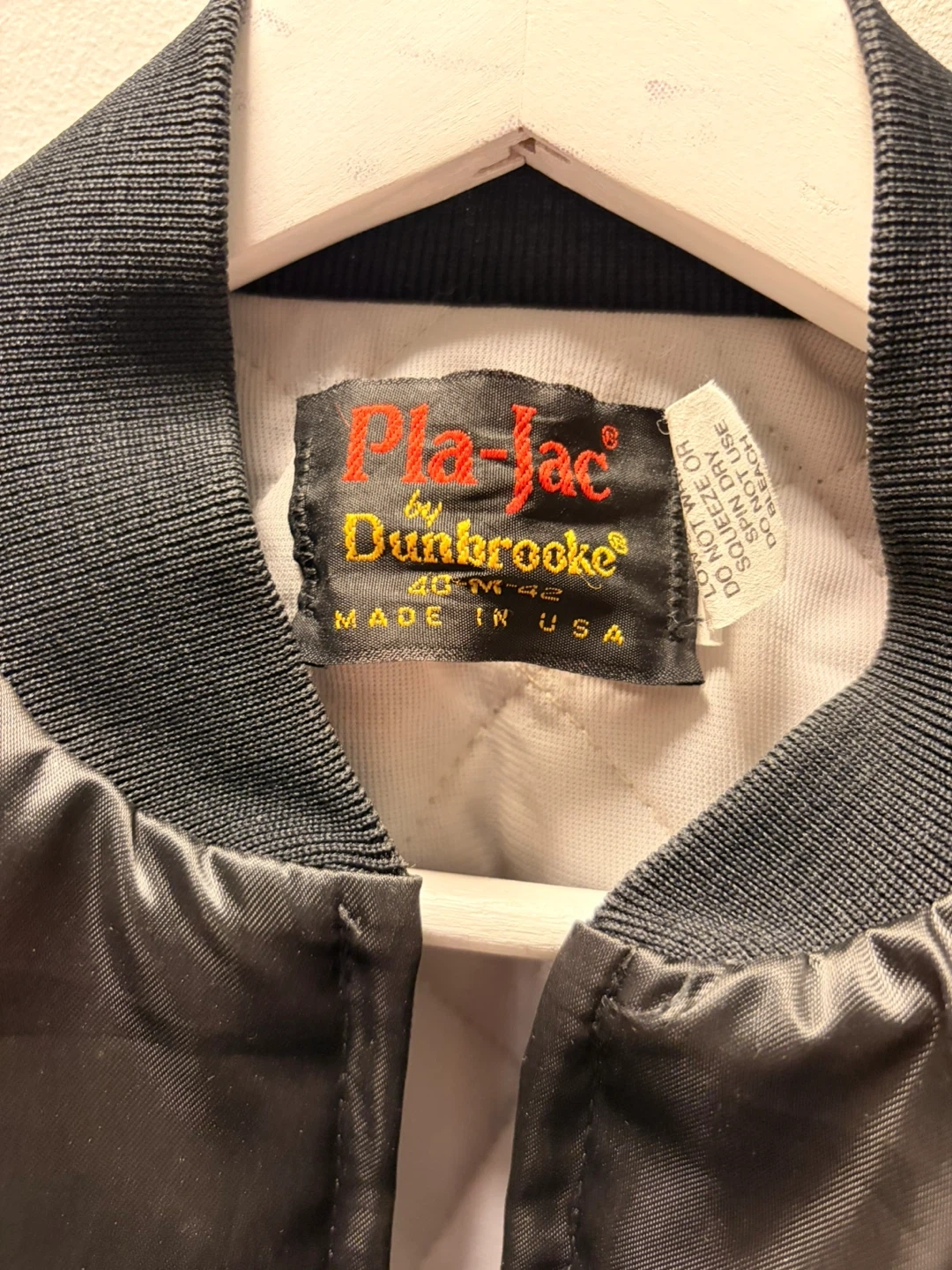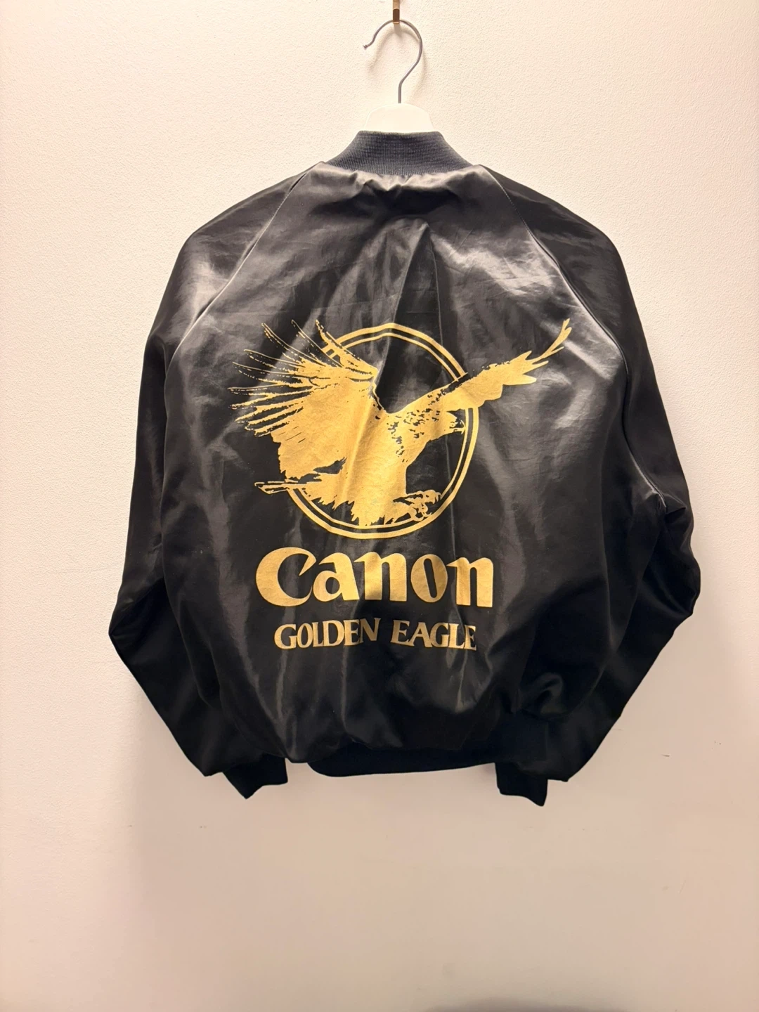 Here's a cool vintage Pla-Jac by Dunbrooke bomber jacket! It's a sleek black colour with the Canon Golden Eagle logo on the back. The size is a tiny M (maybe men’s XS). Perfect for adding a retro touch to your wardrobe