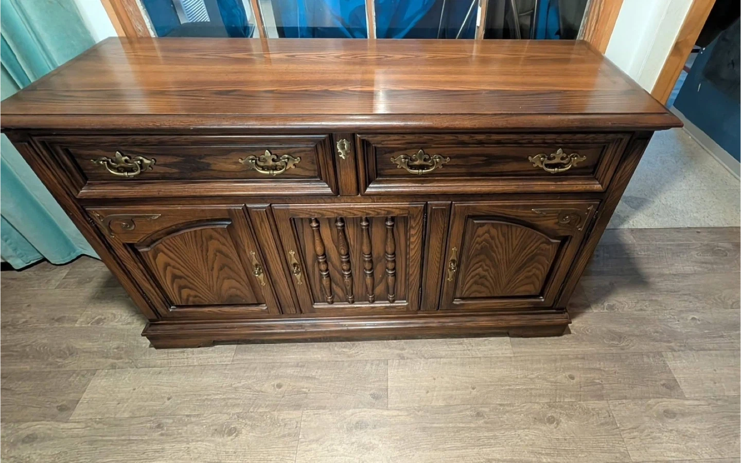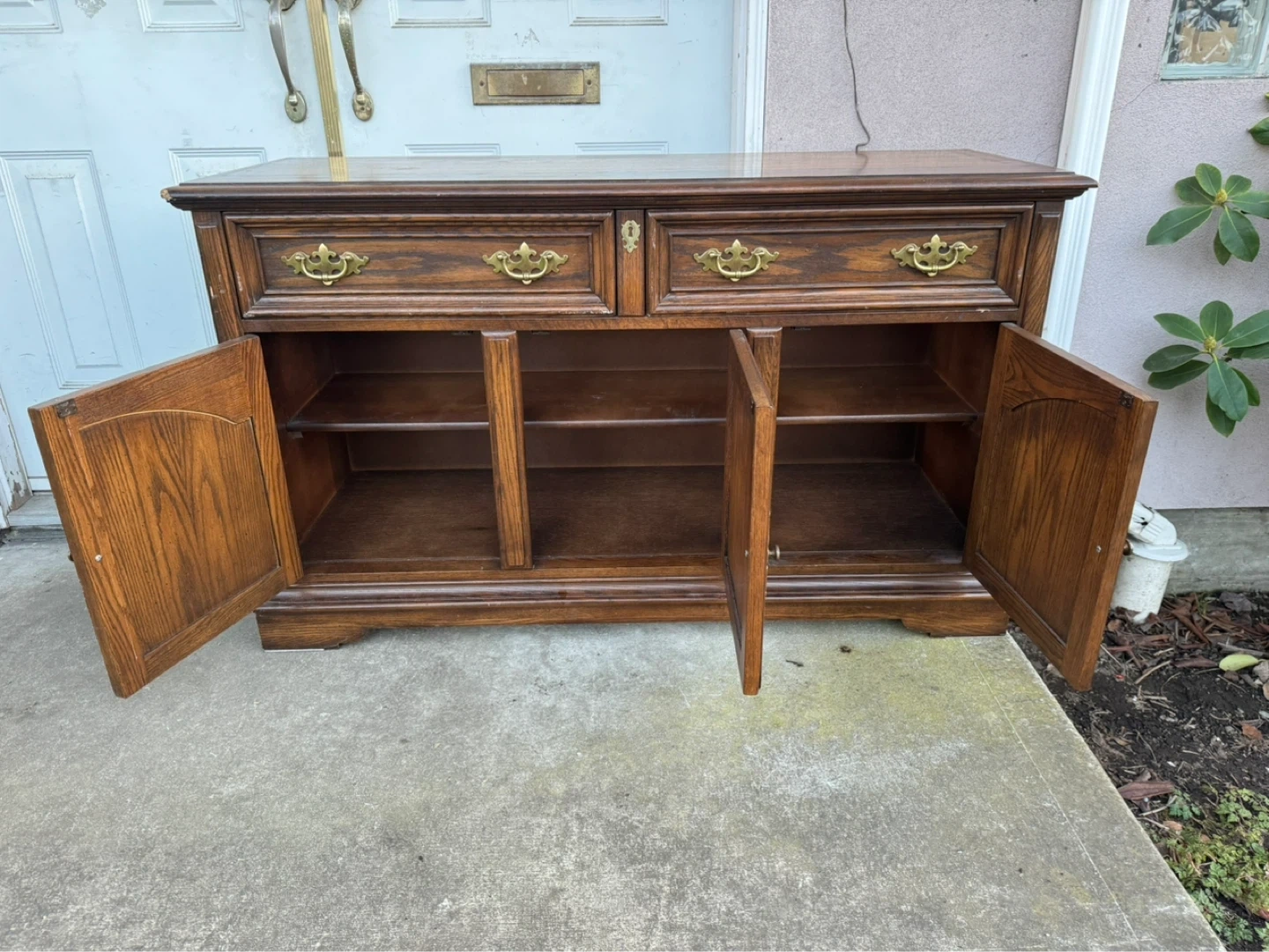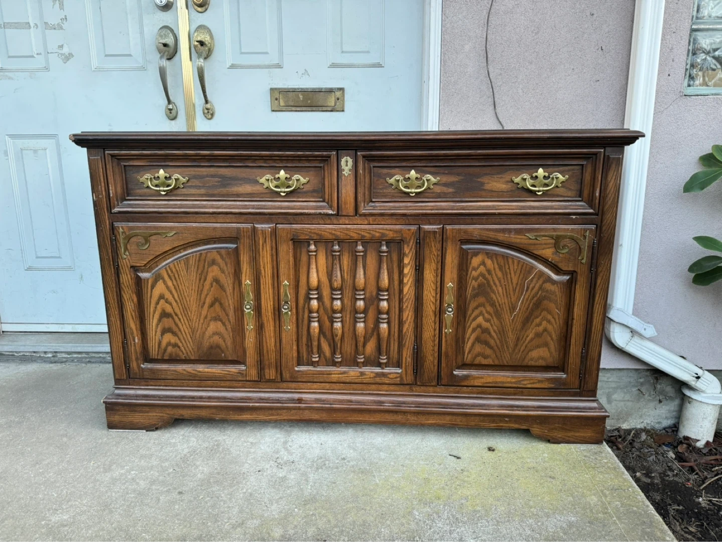 A beautiful dark wood sideboard with ornate brass hardware. It features multiple drawers and cabinet doors for ample storage. This piece would be great for a dining room or living area! Small damage in the left side
