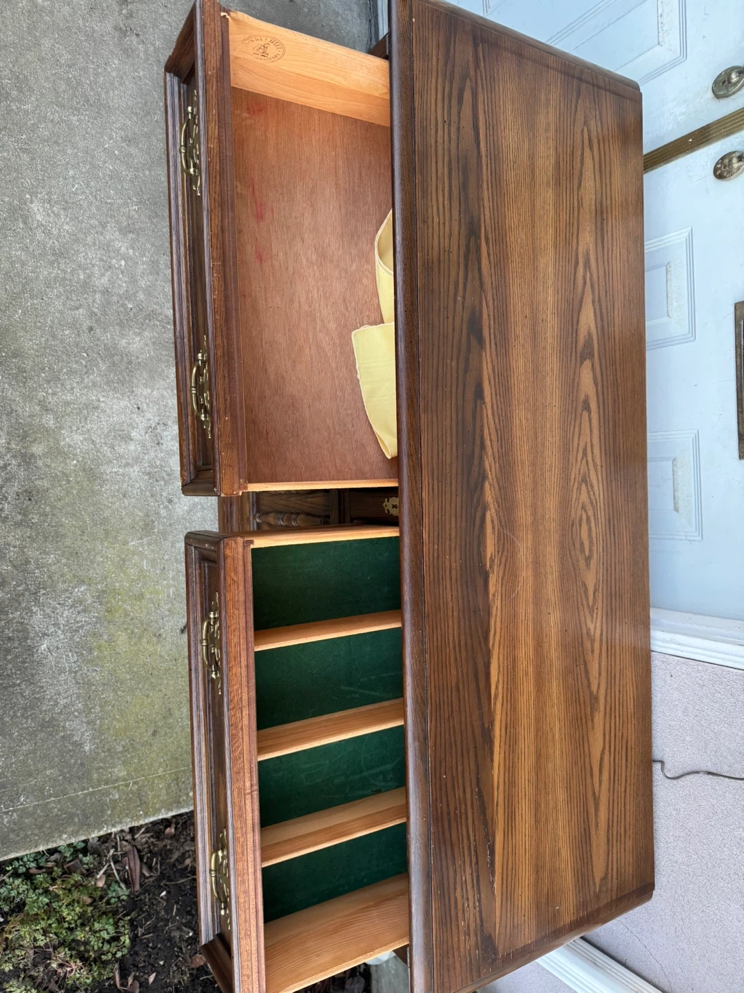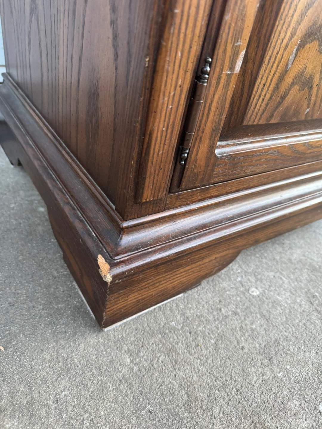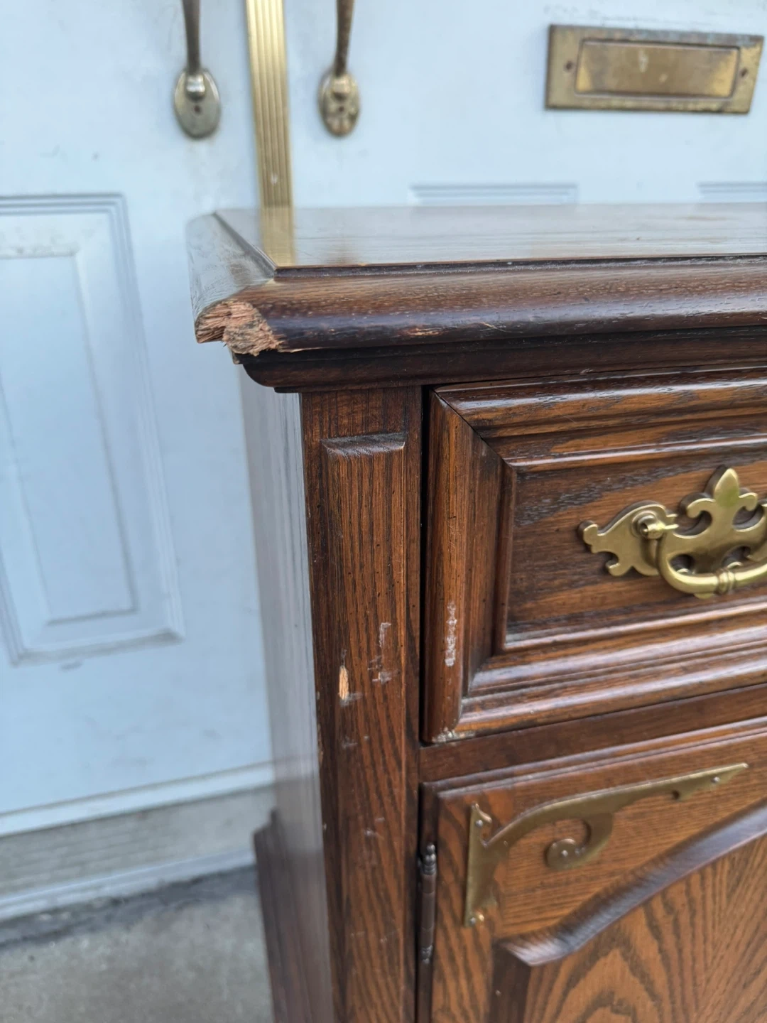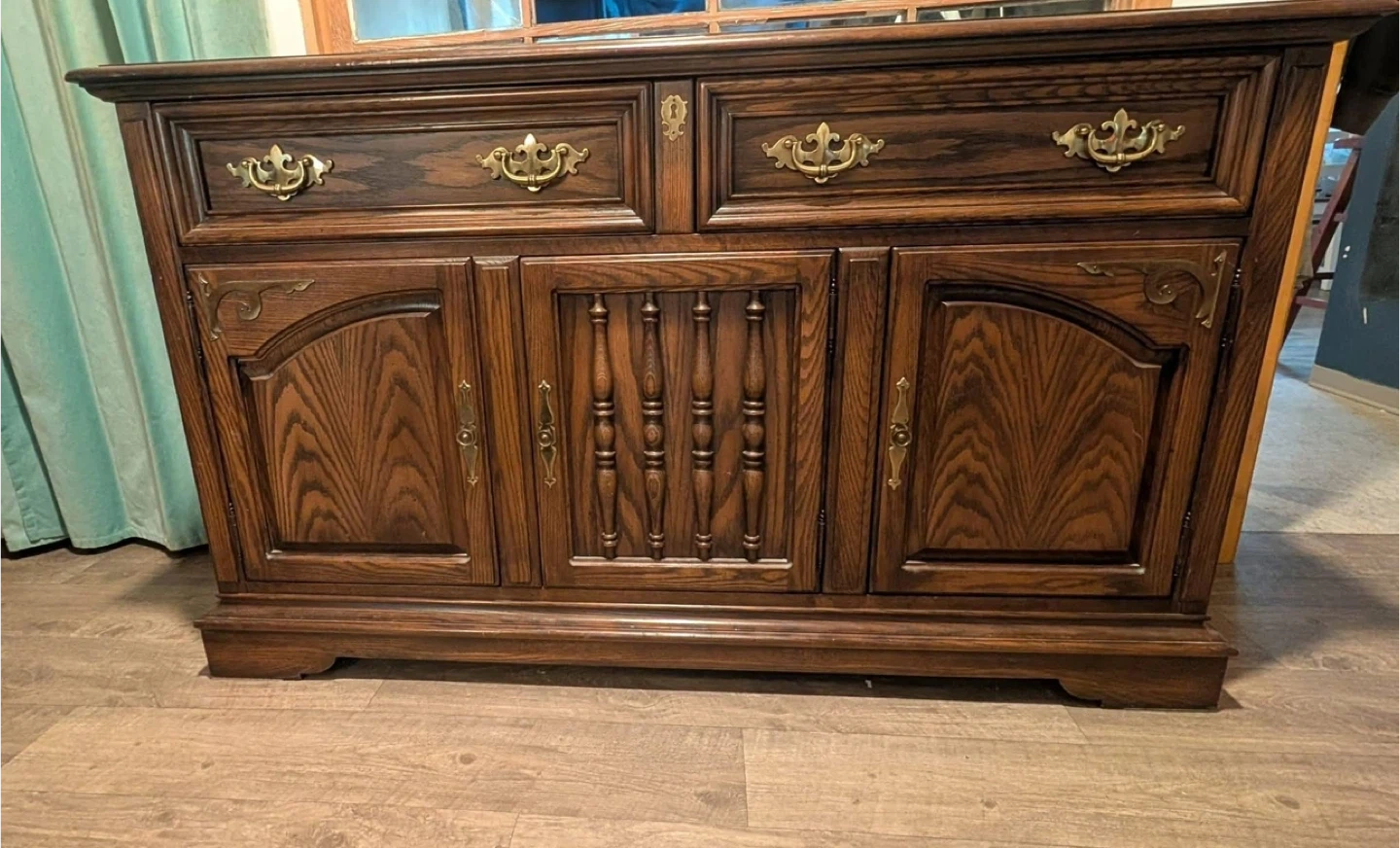 A beautiful dark wood sideboard with ornate brass hardware. It features multiple drawers and cabinet doors for ample storage. This piece would be great for a dining room or living area! Small damage in the left side