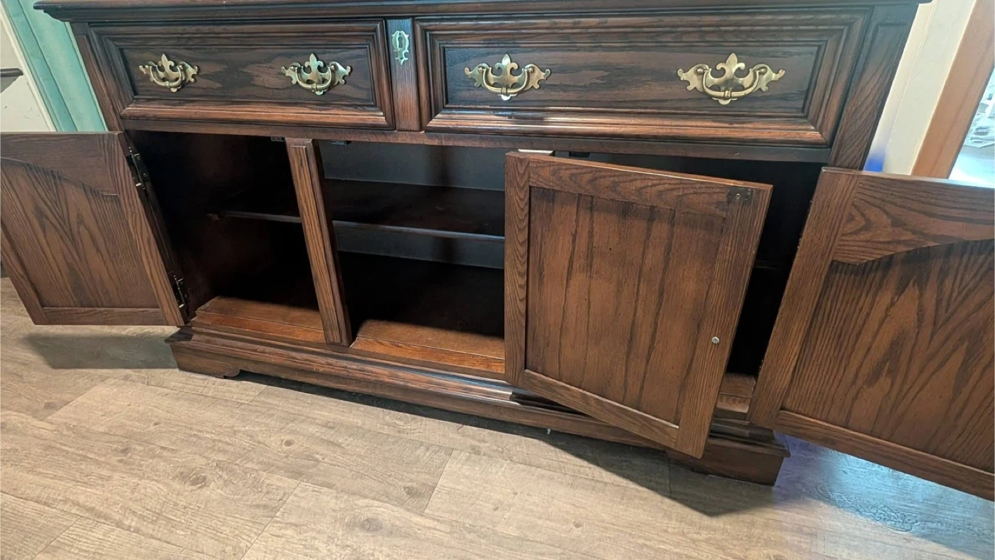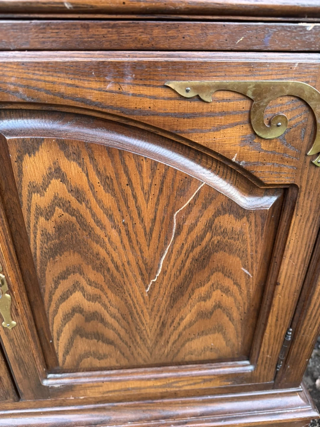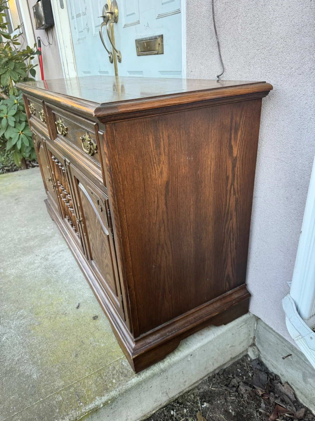 A beautiful dark wood sideboard with ornate brass hardware. It features multiple drawers and cabinet doors for ample storage. This piece would be great for a dining room or living area! Small damage in the left side