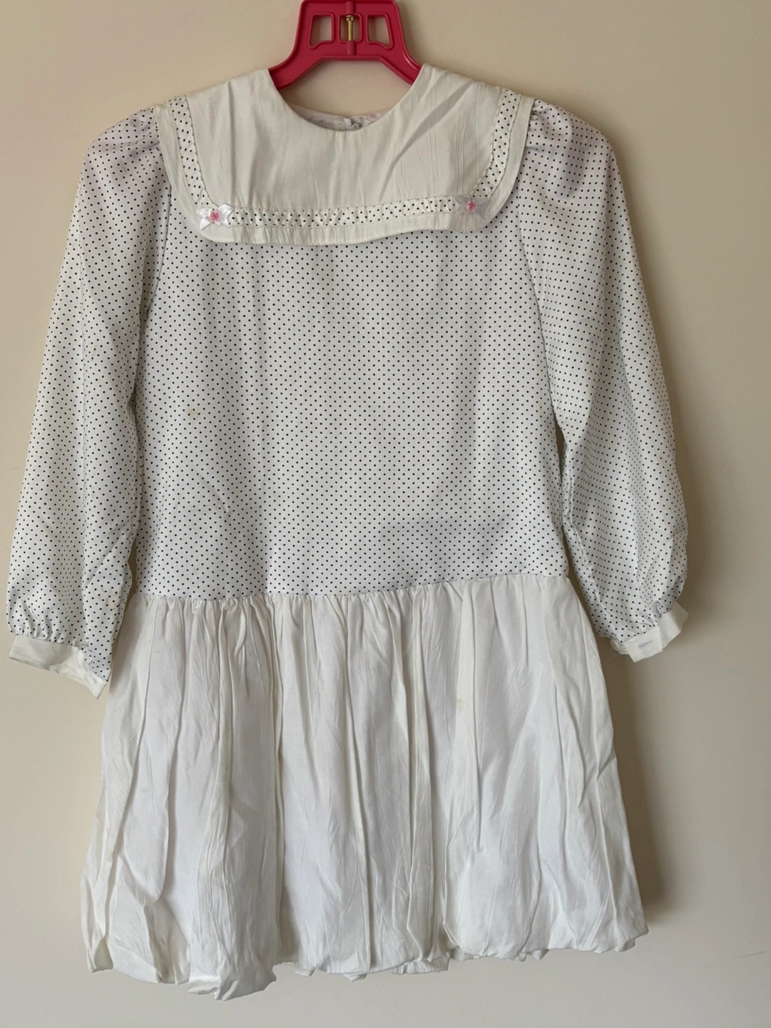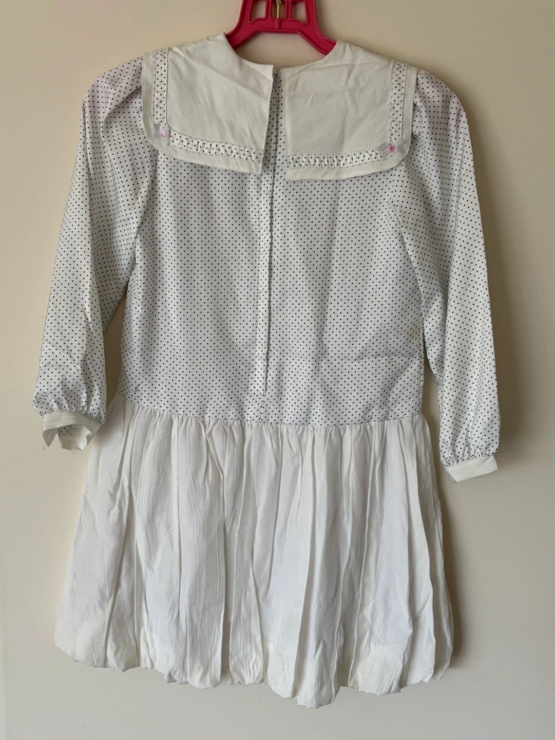 Adorable white dress with black polka dots. Sailor collar. Three quarter sleeves. A-line skirt. Back zipper closure. Excellent condition. Length 29”, waist 29” and sleeves 18”. Size 10.