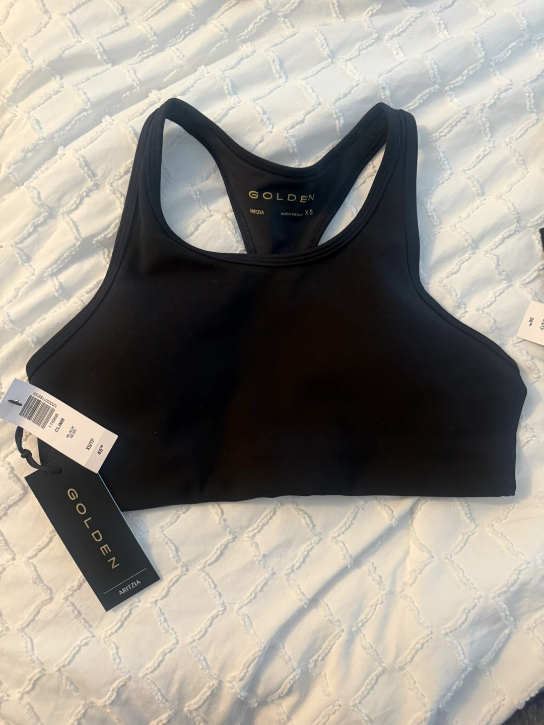 Aritzia Golden padded sports bra in black. It's a racerback style. Size XS. Made in Vietnam. Perfect for workouts!