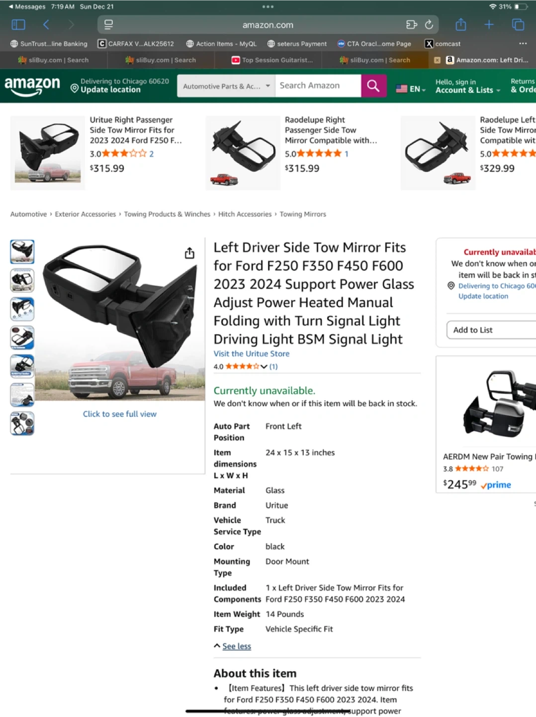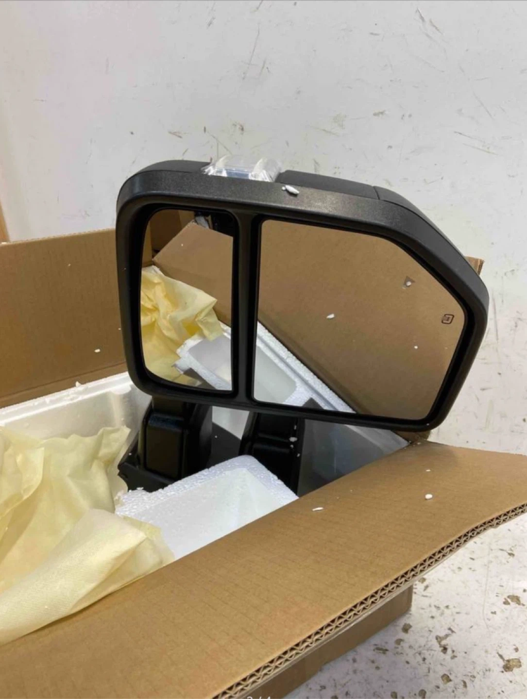 Selling a new left driver side tow mirror! It fits Ford F250 F350 F450 F600 2023-2024 models. It is a power glass adjust, heated, manual folding mirror with turn signal light and driving light BSM signal light. It measures 24 x 15 x 13 inches and weighs 14 pounds. The box is included!
