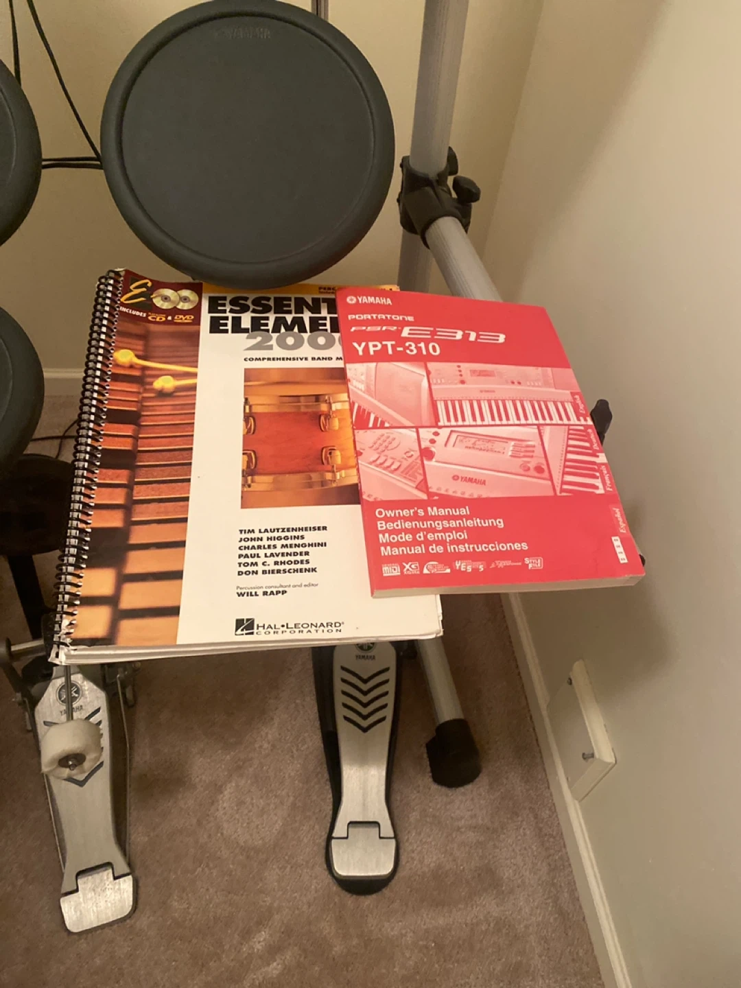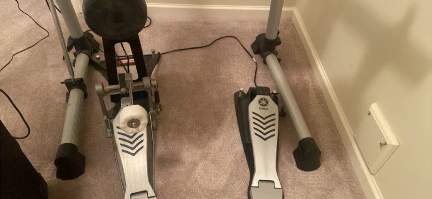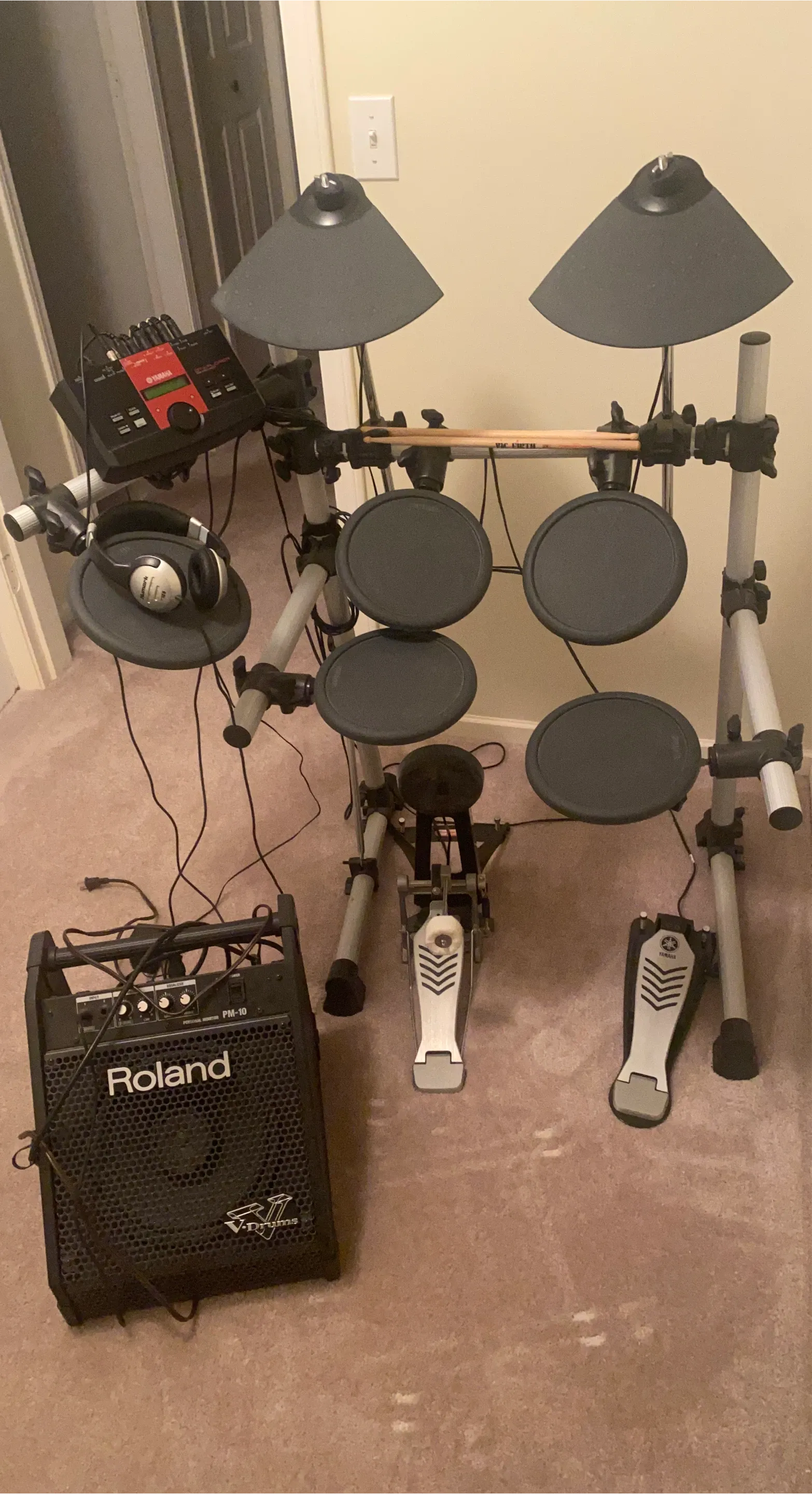 This is a Yamaha electronic drum kit, perfect for practice or small gigs. It includes a Roland PM-10 personal monitor amplifier and a pair of headphones. The kit features multiple drum pads and cymbal pads, along with kick and hi-hat pedals. It's a great setup for any drummer looking to expand their sound options!