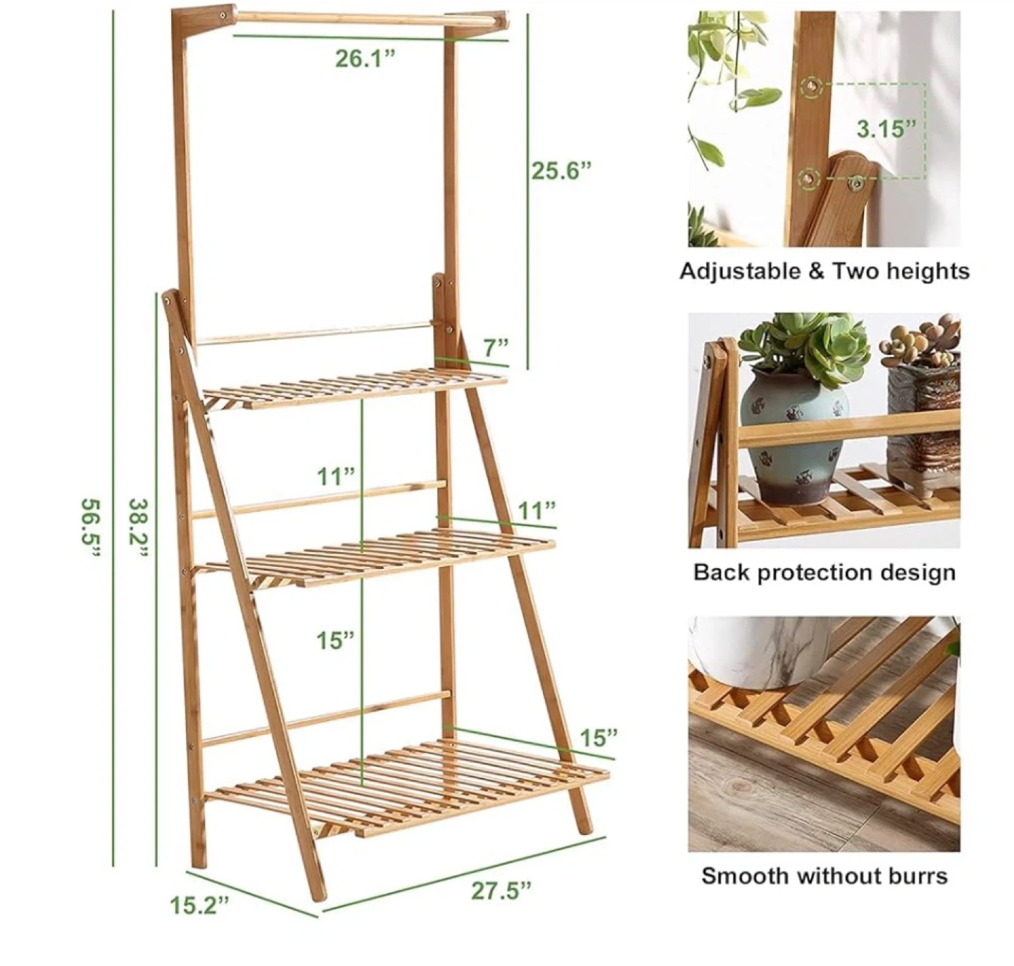 This bamboo tiered plant stand has three shelves and a hanging rod. It's adjustable and has a back protection design for stability. The smooth, burr-free wood makes it great for indoor or outdoor use.