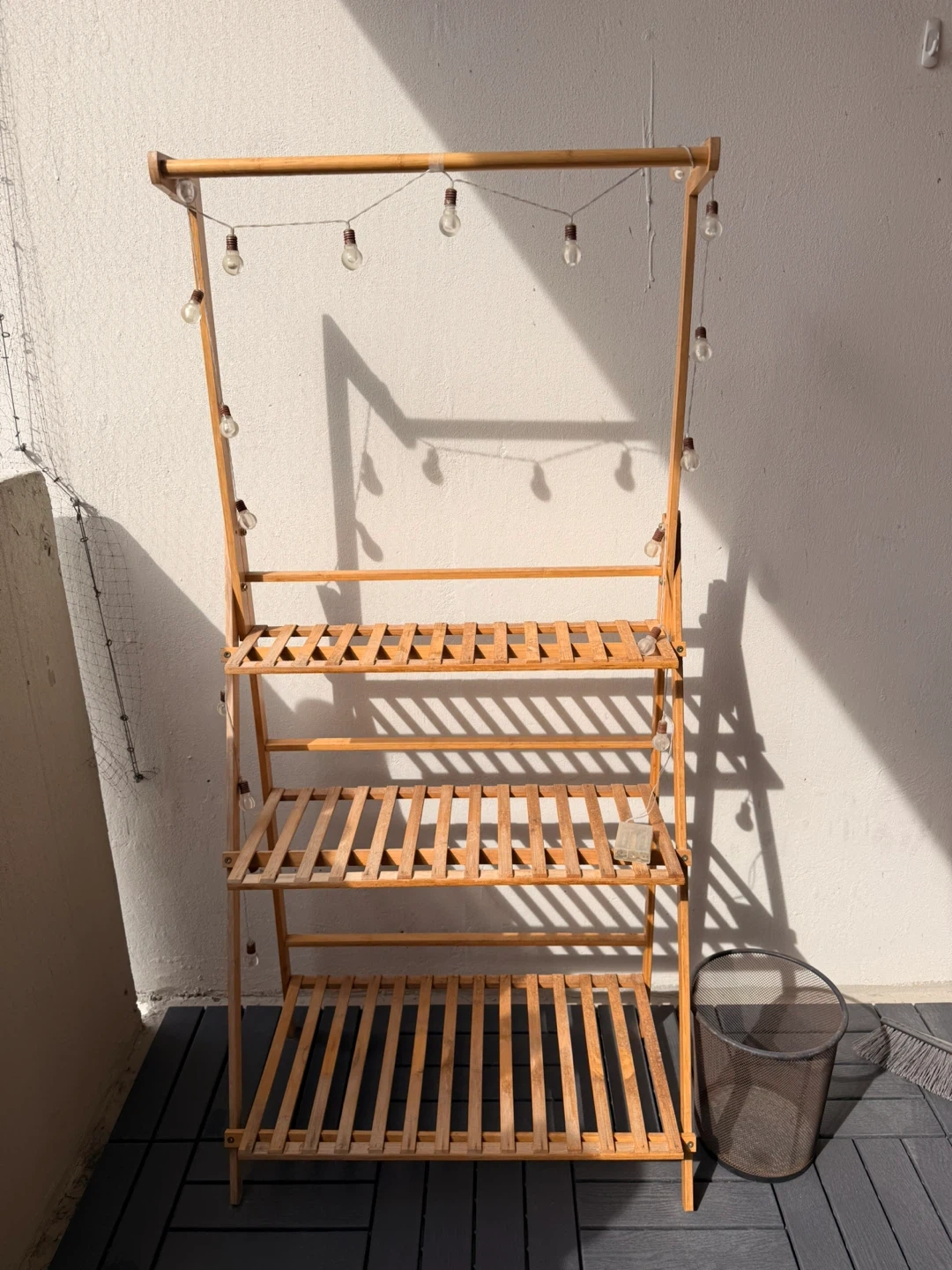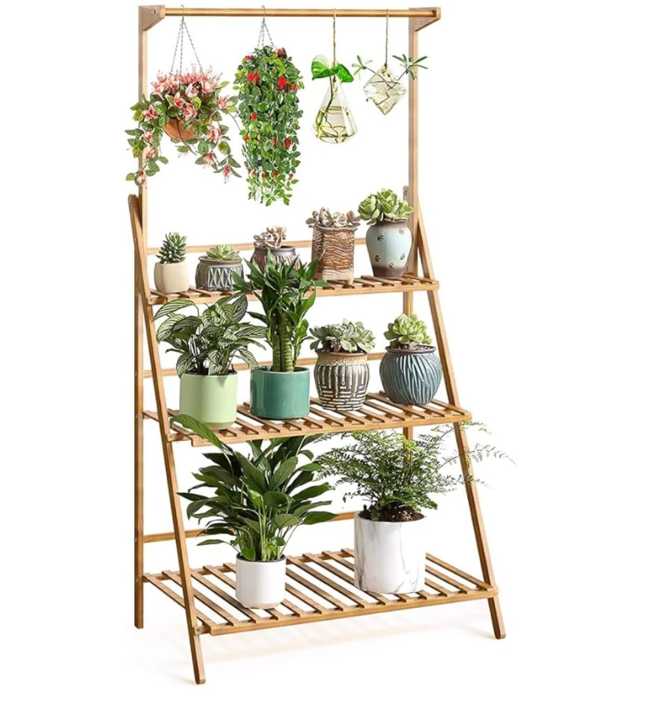 This bamboo tiered plant stand has three shelves and a hanging rod. It's adjustable and has a back protection design for stability. The smooth, burr-free wood makes it great for indoor or outdoor use.