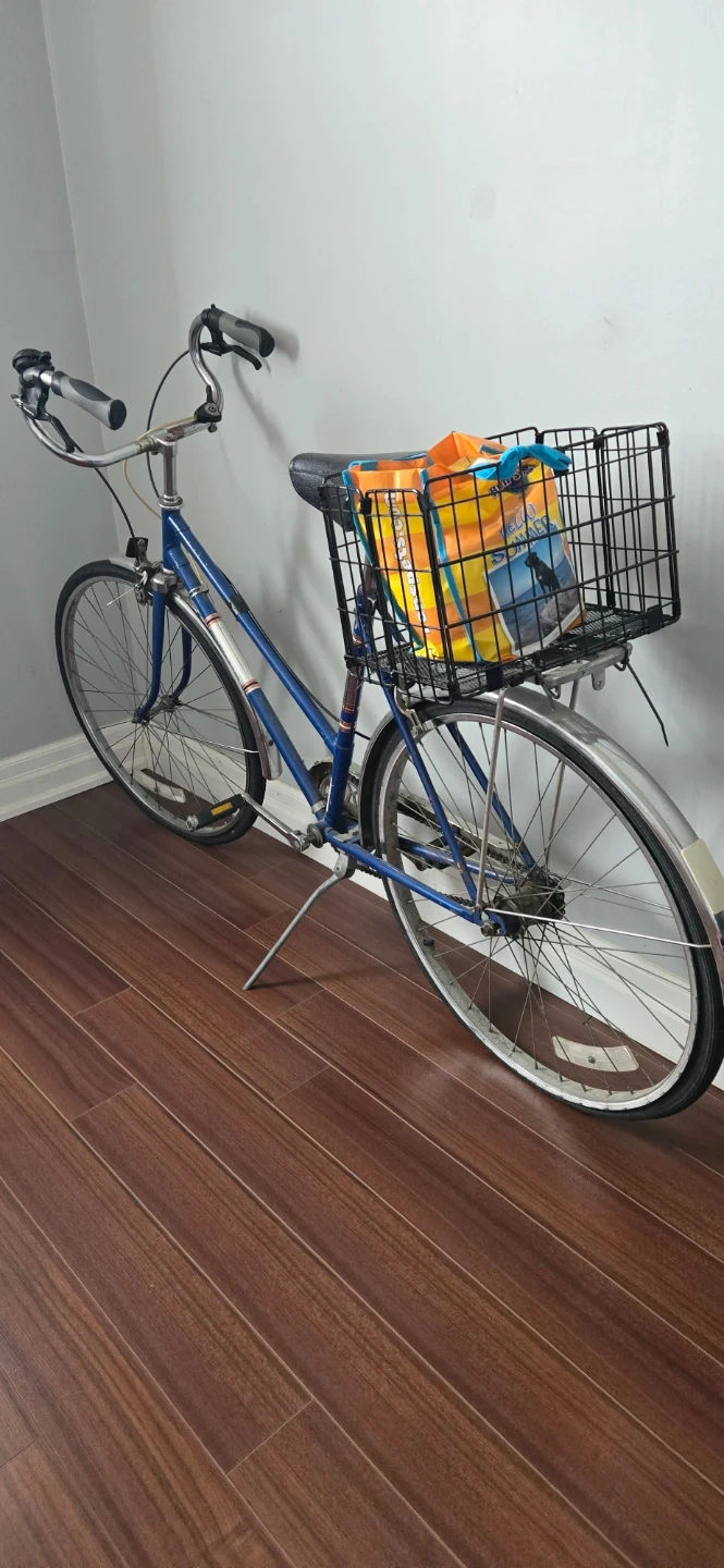 This is a blue cruiser bicycle with a rear basket. It's designed for comfortable riding around town. It features a sturdy frame and reliable components for everyday use.
