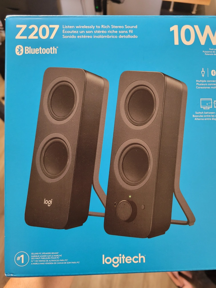 Black speakers with a 10W power output and Bluetooth connectivity. Includes a volume control knob and power button. Easy-switch technology lets you seamlessly switch between audio sources.