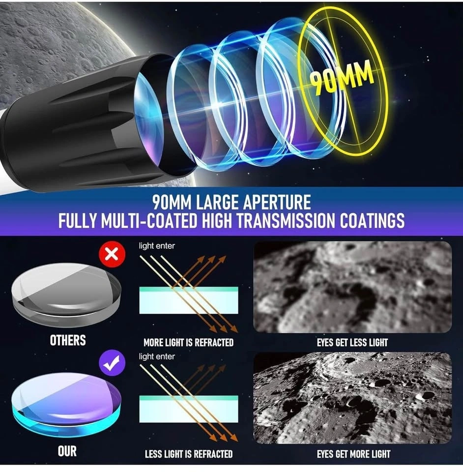 It features a 90mm large aperture and 800mm focal length (f/8.88) with FMC high transmission coatings. The 90mm objective lens gathers more light than smaller telescopes, providing brighter, sharper, and clearer images. The fully coated optical glass lenses protect your eyes and create amazing views of the stars and moon.