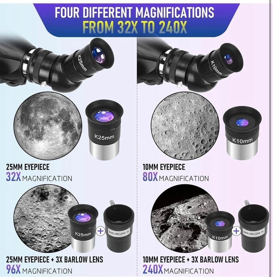 Magnification ranges from 32x to 240x with the included 10mm and 25mm eyepieces and a 3x Barlow lens. A finder scope helps you easily locate objects, and the zenith mirror ensures an upright image. It's ideal for observing celestial objects at night and terrestrial views during the day.