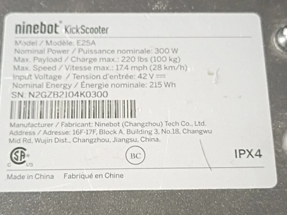 This Ninebot KickScooter is model E25A. It has a nominal power of 300 W and a max payload of 220 lbs. The max speed is 17.4 mph. It's great for commuting around the city!