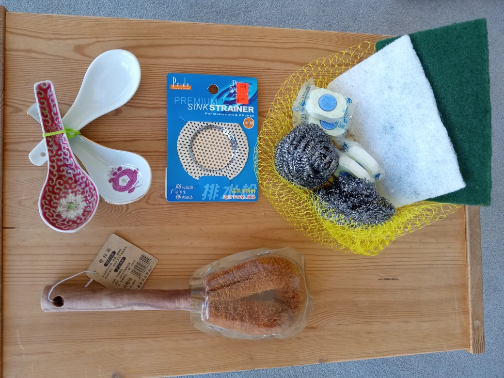 Scrub pads, dish washer detergent tabs, new coconut fiber scrubbing tool with wood handle, ceramic spoons, drain hair catcher (2.75"/ 1.75")