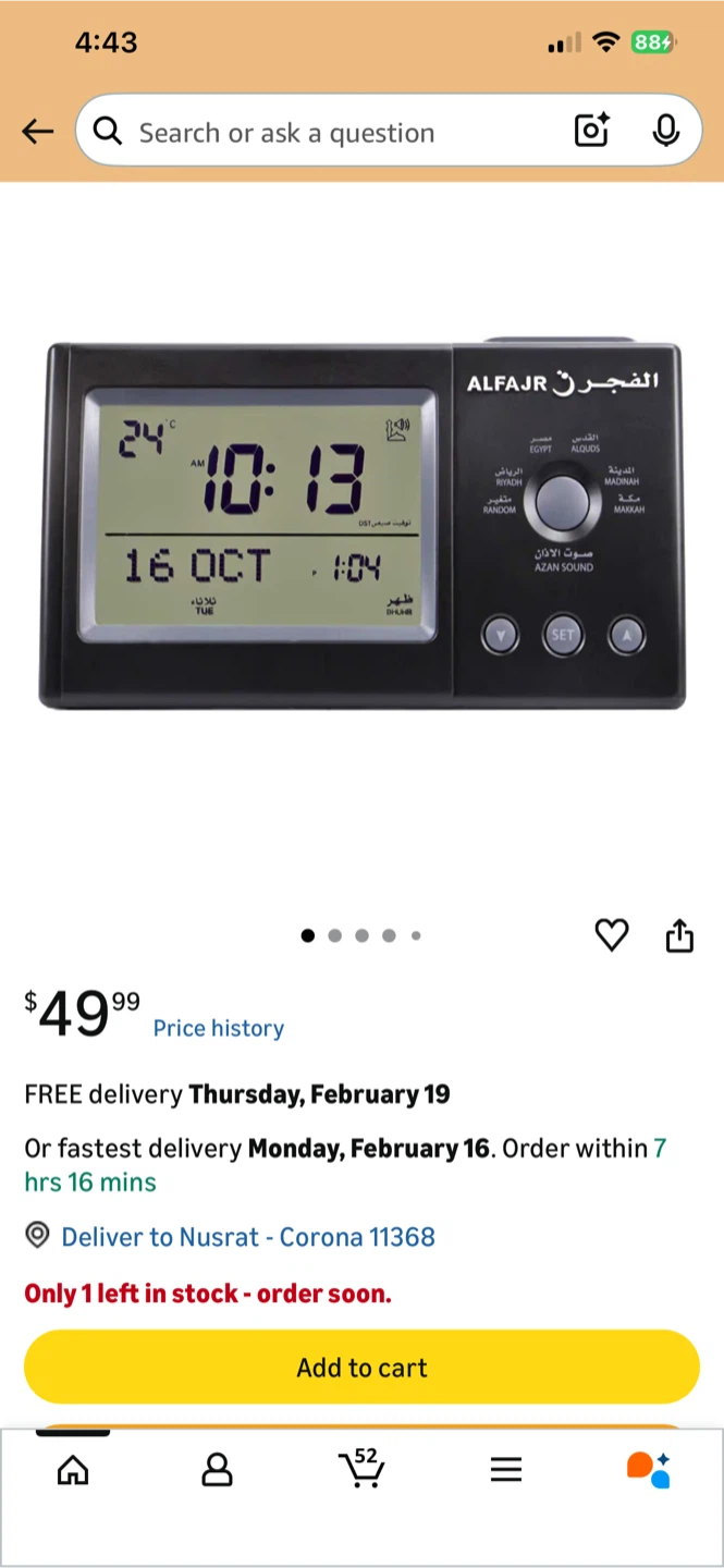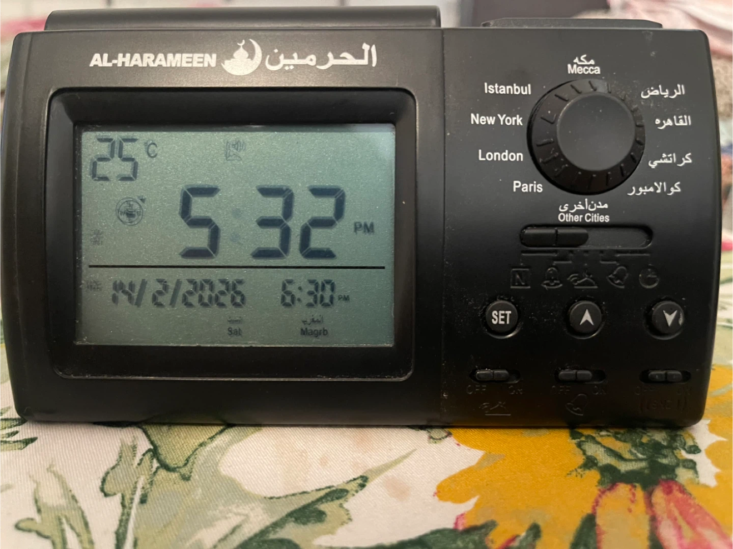 This Islamic Prayer Clock displays time, date, and prayer times. It features multiple city settings and alarm functions. Includes original box and manual.