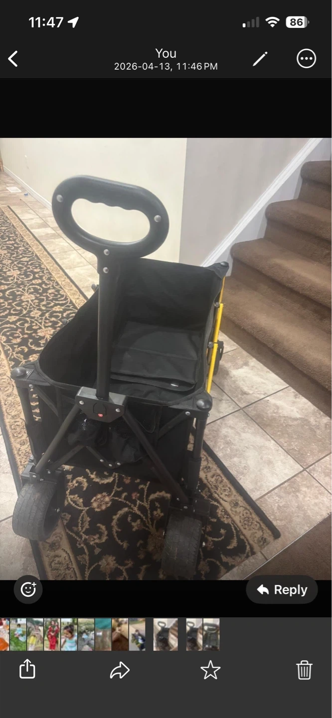 This folding wagon cart is black with yellow accents. It has a sturdy handle and large wheels for easy transport. It's perfect for hauling gear to the park or sporting events. Folds for convenient storage.