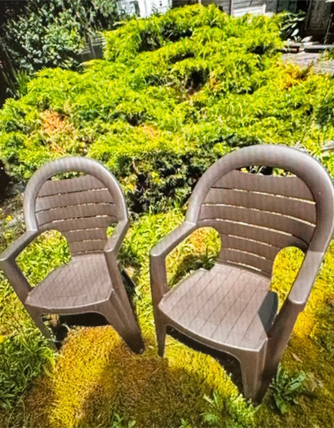 Selling a set of five brown plastic outdoor chairs. These are durable and weather-resistant. They're perfect for a patio, deck, or garden space. Chairs are made of sturdy plastic.