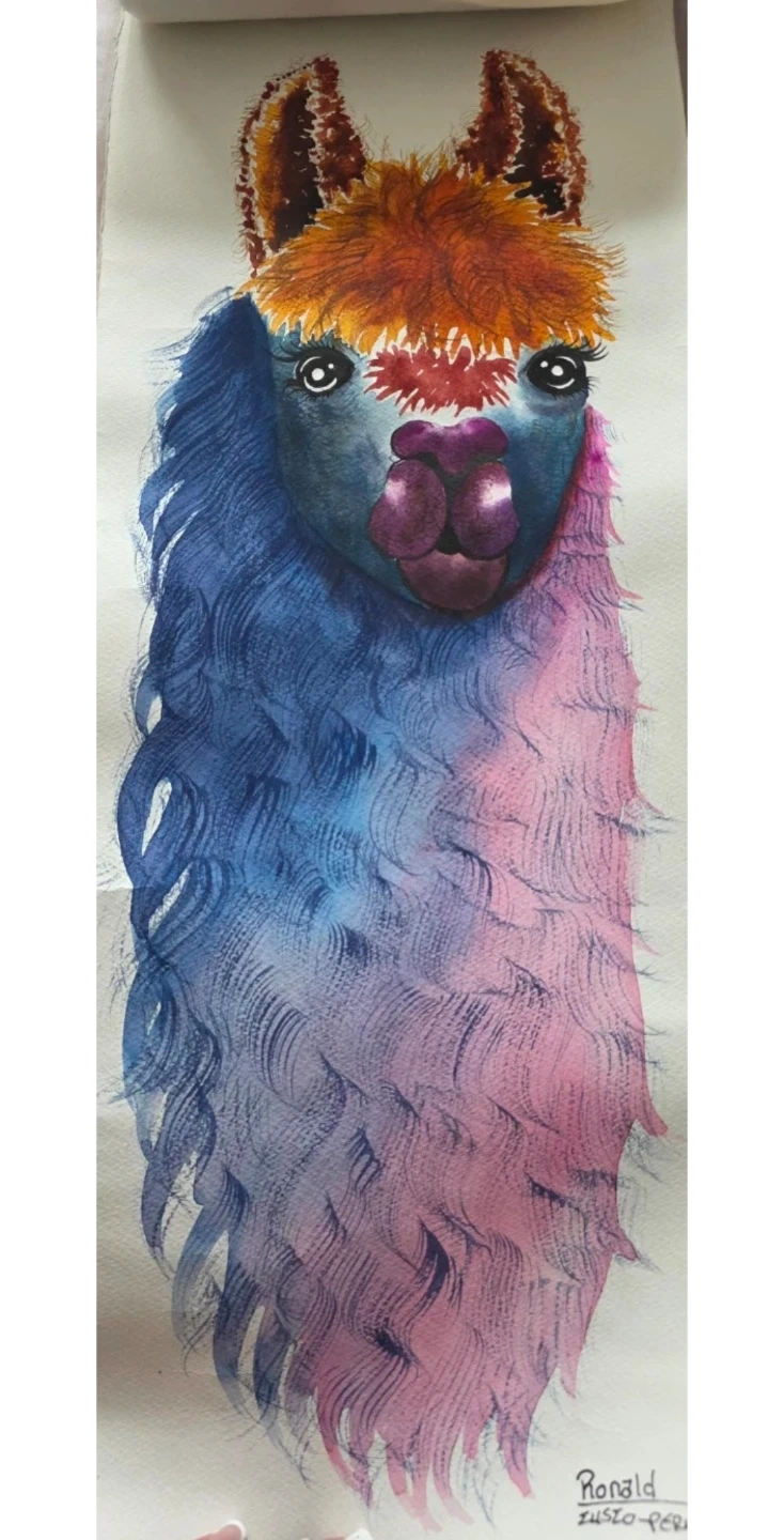 This is a unique watercolor painting featuring a llama. It's rendered in vibrant shades of blue, pink, and orange. The artwork has a whimsical style, perfect for adding a splash of color to any room! Dimensions 7.25" by 18.5"