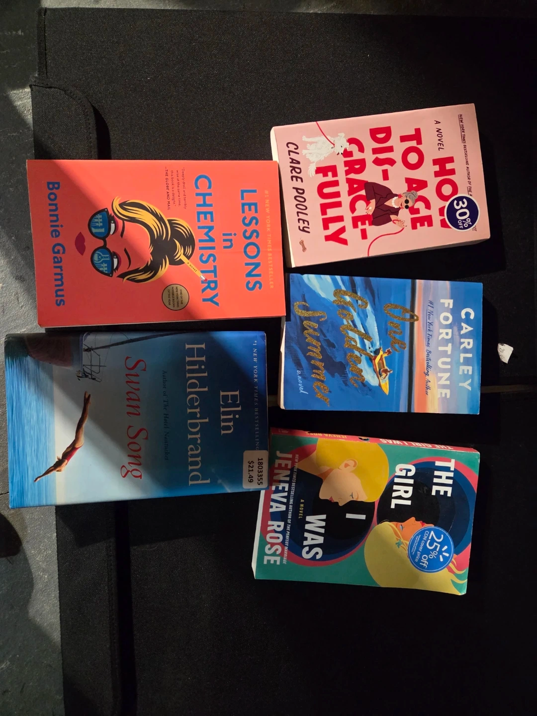 Includes 'Lessons in Chemistry' by Bonnie Garmus, 'How to Age Disgracefully' by Clare Pooley, 'Swan Song' by Elin Hilderbrand, 'I Was The Girl' by Jeneva Rose, and 'Summer of Lost and Found' by Carley Fortune. These are paperback editions of popular fiction titles. Great for avid readers!