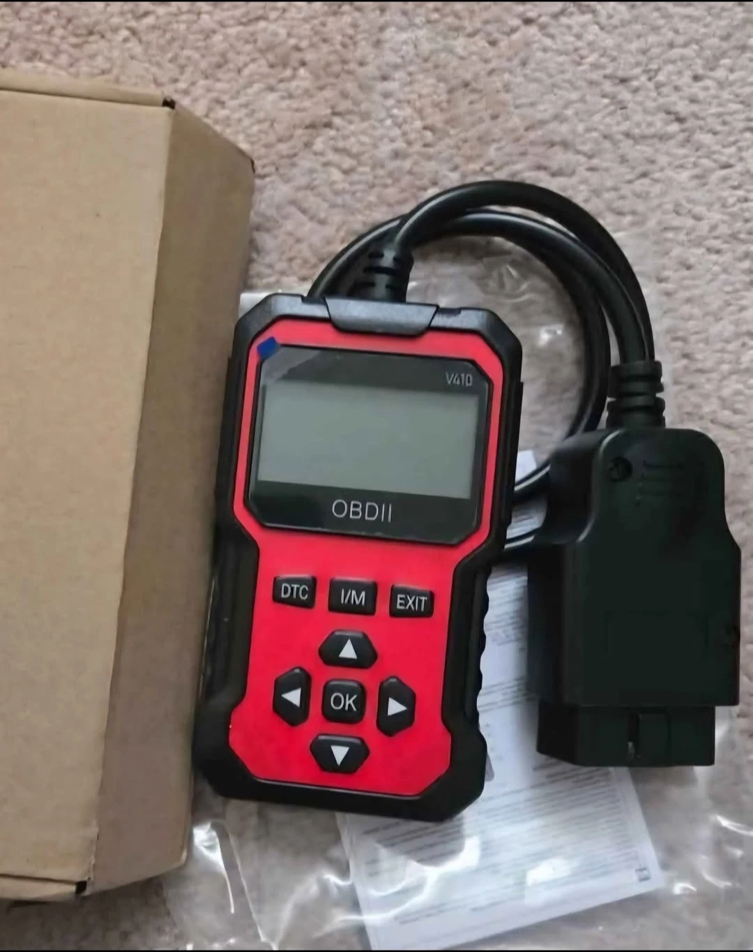 This is an OBDII V410 car diagnostic scanner tool. It's red and black with a clear LCD display and easy-to-use buttons. Includes the main unit, OBDII cable, and box. Reads diagnostic trouble codes (DTCs) and provides I/M readiness status.