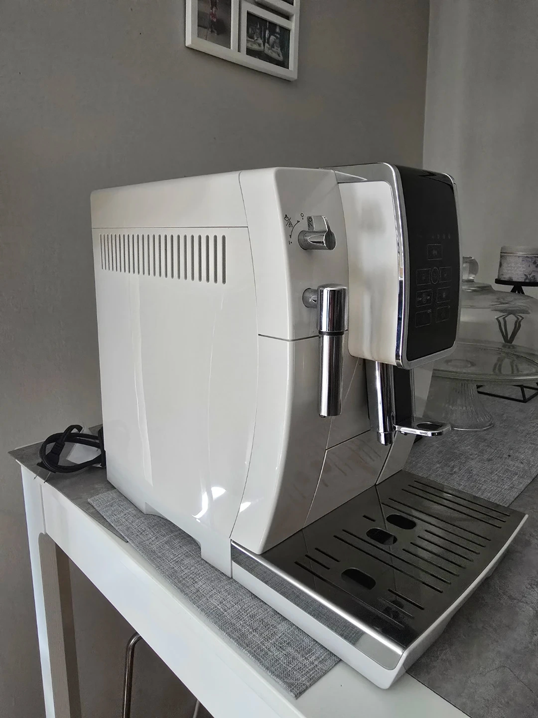 This De'Longhi Dinamica features a fully automatic coffee and espresso system. It includes a burr grinder and a descaling solution. White colour.