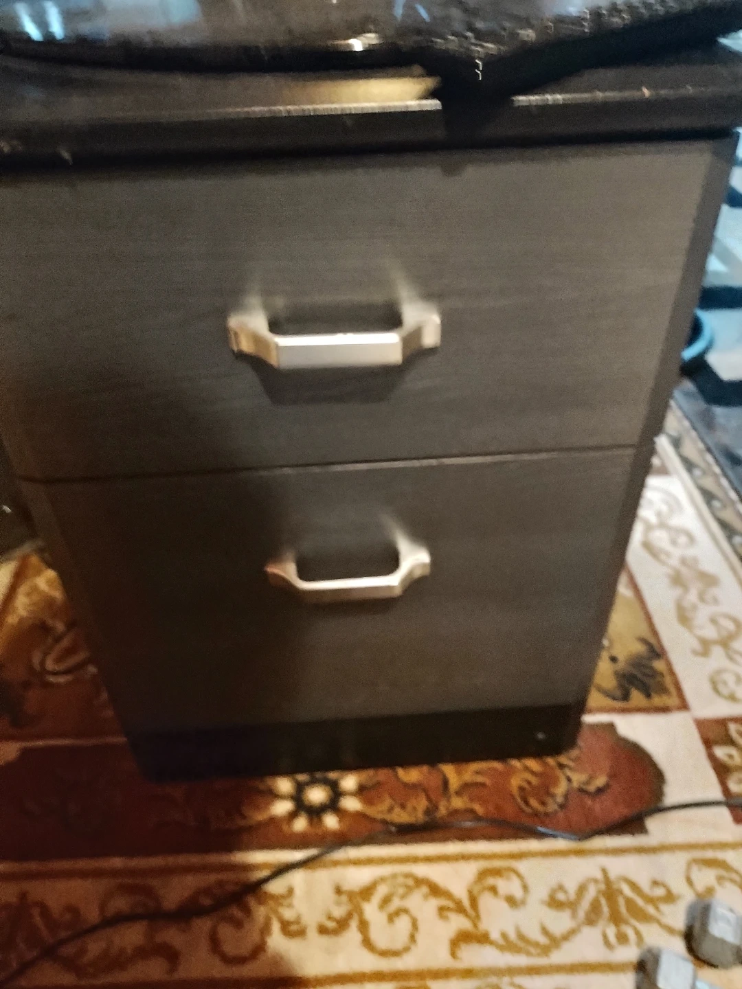 This is a dark grey filing cabinet with two drawers. It features silver handles and a wood-grain finish on the top drawer. It's a handy piece for organizing your office space.
